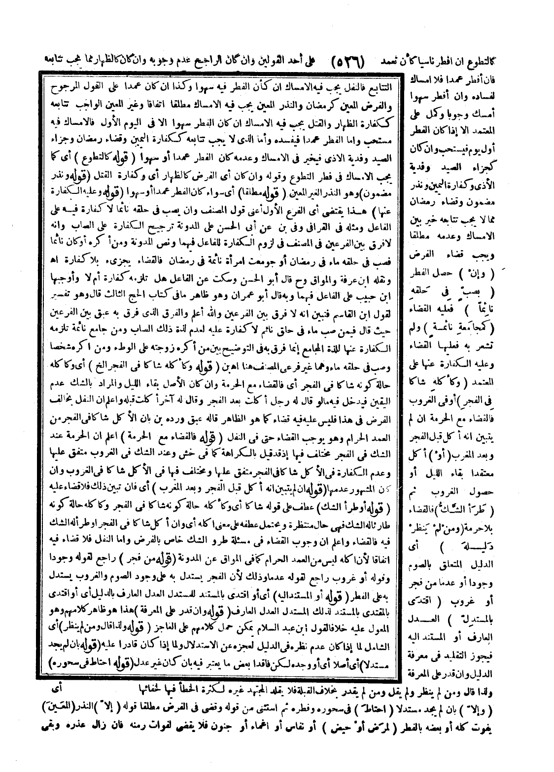 (قَوْلُهُ إنْ لَمْ يَتَبَيَّنْ أَنَّهُ أَكَلَ قَبْلَ الْفَجْرِ وَبَعْدَ الْمَغْرِبِ) أَيْ فَإِنْ تَبَيَّنَ ذَلِكَ فَلَا قَضَاءَ عَلَيْهِ (قَوْلُهُ أَوْ طَرَأَ الشَّكُّ) عَطْفٌ عَلَى قَوْلِهِ شَاكًّا أَيْ وَكَأَكْلِهِ حَالَةَ كَوْنِهِ شَاكًّا فِي الْفَجْرِ وَكَأَكْلِهِ حَالَةَ كَوْنِهِ طَارِئًا لَهُ الشَّكُّ فَهِيَ حَالٌ مُنْتَظِرَةٌ وَيُحْتَمَلُ عَطْفُهُ عَلَى مَعْنَى أَكْلِهِ أَيْ وَإِنْ أَكَلَ شَاكًّا فِي الْفَجْرِ أَوْ طَرَأَ لَهُ الشَّكُّ فِيهِ فَالْقَضَاءُ وَاعْلَمْ أَنَّ وُجُوبَ الْقَضَاءِ فِي مَسْأَلَةِ طُرُوُّ الشَّكِّ خَاصٌّ بِالْفَرْضِ، وَأَمَّا النَّفَلُ فَلَا قَضَاءَ فِيهِ اتِّفَاقًا؛ لِأَنَّ أَكْلَهُ لَيْسَ مِنْ الْعَمْدِ الْحَرَامِ كَمَا فِي الْمَوَّاقِ عَنْ الْمُدَوَّنَةِ (قَوْلُهُ مِنْ فَجْرٍ) رَاجِعٌ لِقَوْلِهِ وُجُودًا وَقَوْلُهُ أَوْ غُرُوبٍ رَاجِعٌ لِقَوْلِهِ عَدَمًا وَذَلِكَ؛ لِأَنَّ الْفَجْرَ يُسْتَدَلُّ بِهِ عَلَى وُجُودِ الصَّوْمِ وَالْغُرُوبَ يُسْتَدَلُّ بِهِ عَلَى الْفِطْرِ (قَوْلُهُ أَوْ الْمُسْتَنِدِ إلَيْهِ) أَيْ أَوْ اقْتَدَى بِالْمُسْتَنِدِ لِلْمُسْتَدِلِّ الْعَدْلِ الْعَارِفِ بِالدَّلِيلِ أَوْ اقْتَدَى بِالْمُقْتَدِي بِالْمُسْتَنِدِ لِذَلِكَ الْمُسْتَدِلِّ الْعَدْلِ الْعَارِفِ (قَوْلُهُ وَإِنْ قَدَرَ عَلَى الْمَعْرِفَةِ) هَذَا هُوَ ظَاهِرُ كَلَامِهِمْ، وَهُوَ الْمُعَوَّلُ عَلَيْهِ خِلَافًا لِقَوْلِ ابْنِ عَبْدِ السَّلَامِ يُمْكِنُ حَمْلُ كَلَامِهِمْ عَلَى الْعَاجِزِ (قَوْلُهُ وَلِذَا قَالَ وَمَنْ لَمْ يَنْظُرْ) أَيْ الشَّامِلُ لِمَا إذَا كَانَ عَدَمُ نَظَرِهِ فِي الدَّلِيلِ لِعَجْزِهِ عَنْ الِاسْتِدْلَالِ وَلِمَا إذَا كَانَ قَادِرًا عَلَيْهِ (قَوْلُهُ بِأَنْ لَمْ يَجِدْ مُسْتَدِلًّا) أَيْ أَصْلًا أَيْ أَوْ وَجَدَهُ لَكِنْ فَاقِدًا بَعْضَ مَا يُعْتَبَرُ فِيهِ بِأَنْ كَانَ غَيْرَ عَدْلٍ (قَوْلُهُ احْتَاطَ فِي سُحُورِهِ)