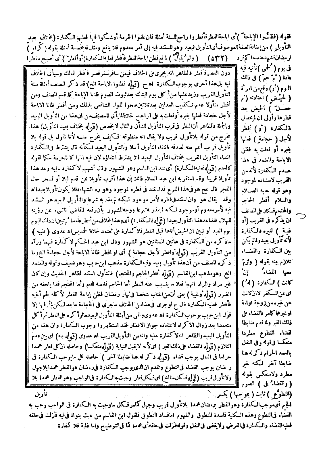 (قَوْلُهُ بِخِلَافٍ بَعِيدِ التَّأْوِيلِ) هَذَا مُخْرَجٌ مِنْ قَوْلِهِ بِلَا تَأْوِيلٍ قَرِيبٍ وَلَا يُقَالُ إنَّهُ مَنْطُوقُهُ فَكَيْفَ يَخْرُجُ مِنْهُ؛ لِأَنَّا نَقُولُ: بَلْ قَوْلُهُ بِلَا تَأْوِيلٍ قَرِيبٍ أَعَمُّ مِنْهُ لِصِدْقِهِ بِانْتِفَاءِ التَّأْوِيلِ أَصْلًا وَبِالتَّأْوِيلِ الْبَعِيدِ فَكَأَنَّهُ قَالَ: يُشْتَرَطُ فِي الْكَفَّارَةِ انْتِفَاءُ التَّأْوِيلِ الْقَرِيبِ بِخِلَافِ التَّأْوِيلِ الْبَعِيدِ فَلَا يُشْتَرَطُ انْتِفَاؤُهُ؛ لِأَنَّ فِيهِ انْتِهَاكًا لِلْحُرْمَةِ حُكْمًا لِقَوْلِهِ كَالْعَدَمِ (قَوْلُهُ فَعَلَيْهِ الْكَفَّارَةُ) أَيْ عِنْدَ ابْنِ الْقَاسِمِ، وَهُوَ الْمَشْهُورُ وَقَالَ أَشْهَبُ: لَا كَفَّارَةَ عَلَيْهِ وَعَدَّ هَذَا تَأْوِيلًا قَرِيبًا وَقَدْ اسْتَقَرَّ بِهِ ابْنُ عَبْدِ السَّلَامِ قَائِلًا إنَّ هَذَا أَقْرَبُ تَأْوِيلًا مِمَّنْ قَدِمَ لَيْلًا أَوْ تَسَحَّرَ حَالَ الْفَجْرِ قَالَ عج هُوَ فِي هَذَا الْفَرْعِ قَدْ اسْتَنَدَ فِي فِطْرِهِ لِمَوْجُودٍ، وَهُوَ رَدُّ الشَّهَادَةِ فَلَا يَكُونُ تَأْوِيلًا بَعِيدًا اهـ وَقَدْ يُقَالُ هُوَ وَإِنْ اسْتَنَدَ فِي فِطْرِهِ لِأَمْرٍ مَوْجُودٍ لَكِنَّهُ لَمْ يُعْذَرْ بِهِ شَرْعًا وَالتَّأْوِيلُ الْبَعِيدُ هُوَ الْمُسْتَنَدُ فِيهِ لِأَمْرٍ مَعْدُومٍ أَوْ مَوْجُودٍ لَكِنَّهُ لَمْ يُعْذَرْ بِهِ شَرْعًا وَوَجْهُ الْمَشْهُورِ بِأَنَّ رَفْعَهُ لِلْقَاضِي نَاشِئٌ عَنْ رُؤْيَتِهِ لِلْهِلَالِ فَلِذَا عُدَّ هَذَا التَّأْوِيلُ بَعِيدًا.