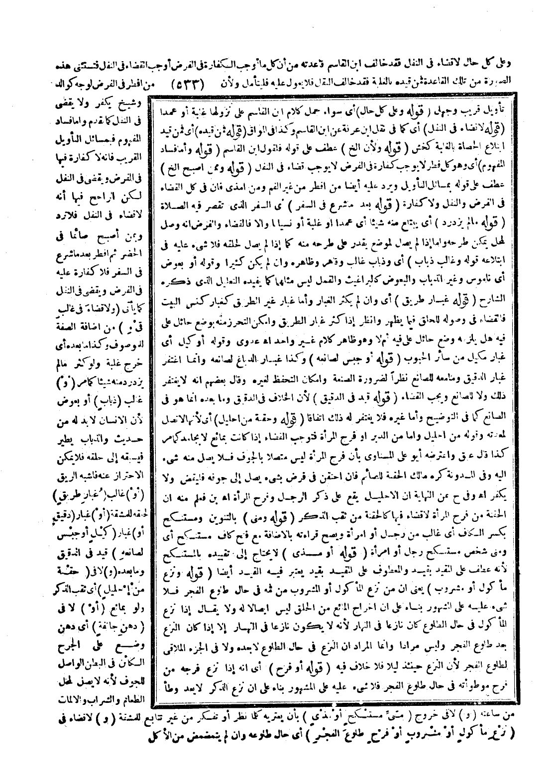 وَعَلَى كُلِّ حَالٍ لَا قَضَاءَ فِي النَّفْلِ فَقَدْ خَالَفَ ابْنُ الْقَاسِمِ قَاعِدَتَهُ مِنْ أَنَّ كُلَّ مَا أَوْجَبَ الْكَفَّارَةَ فِي الْفَرْضِ أَوْجَبَ الْقَضَاءَ فِي النَّفْلِ فَتُسْتَثْنَى هَذِهِ الصُّورَةُ مِنْ تِلْكَ الْقَاعِدَةِ فَمَنْ قَيَّدَهُ بِالْغَلَبَةِ فَقَدْ خَالَفَ النَّفَلَ فَلَا يُعَوَّلُ عَلَيْهِ فَلْيُتَأَمَّلْ؛ وَلِأَنَّ مَنْ أَفْطَرَ فِي الْفَرْضِ لِوَجْهٍ كَالْوَالِدِ وَشَيْخٍ يُكَفِّرُ وَلَا يَقْضِي فِي النَّفْلِ كَمَا تَقَدَّمَ، وَأَمَّا فَسَادُ الْمَفْهُومِ فَبِمَسَائِلِ التَّأْوِيلِ الْقَرِيبِ فَإِنَّهُ لَا كَفَّارَةَ فِيهَا فِي الْفَرْضِ وَيَقْضِي فِي النَّفْلِ لَكِنَّ الرَّاجِحَ فِيهَا أَنَّهُ لَا قَضَاءَ فِي النَّفْلِ فَلَا تُرَدُّ وَبِمَنْ أَصْبَحَ صَائِمًا فِي الْحَضَرِ ثُمَّ أَفْطَرَ بَعْدَمَا شَرَعَ فِي السَّفَرِ فَلَا كَفَّارَةَ عَلَيْهِ فِي الْفَرْضِ وَيَقْضِي فِي النَّفْلِ كَمَا يَأْتِي