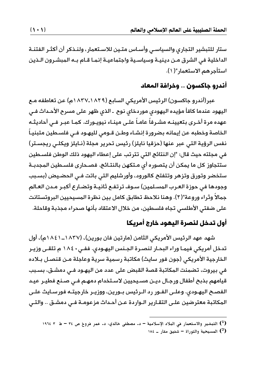 عبر (أندرو جاكسون) الرئيس الأمريكي السابع (1829ـ1837م) عن تعاطفه مع اليهود عندما كافأ مؤيده اليهودي موردخاي نوح ـ الذي ظهر على مسرح الأحداث في عهده مرة أخرى بتعيينه مشرفاً عاماً على ميناء نيويورك. كما عبر في أحاديثه الخاصة وخطبه عن إيمانه بضرورة إنشاء وطن قومي لليهود في فلسطين متبنياً نفس الرؤية التي عبر عنها (حزقيا نايلز) رئيس تحرير مجلة (نايلز ويكلي ريجستر) في مجلته حيث قال: "إن النتائج التي تترتب على إعطاء اليهود ذلك الوطن فلسطين ستتجاوز كل ما يمكن أن يتصوره أي متكهن بالنتائج. فصحارى فلسطين المجدبة ستخضر وتورق وتزهر وتتفتح كالورود، وأورشليم التي باتت في الحضيض (بسبب وجودها في حوزة العرب المسلمين) سوف ترتفع ثانية وتضارع أكبر مدن العالم جمالاً وثراء وروعة" (¬2). وهنا نلاحظ تطابق كامل بين نظرة المسيحيين البروتستانت على ضفتي الأطلسي تجاه فلسطين، من خلال الاعتقاد بأنها صحراء مجذبة وقاحلة.