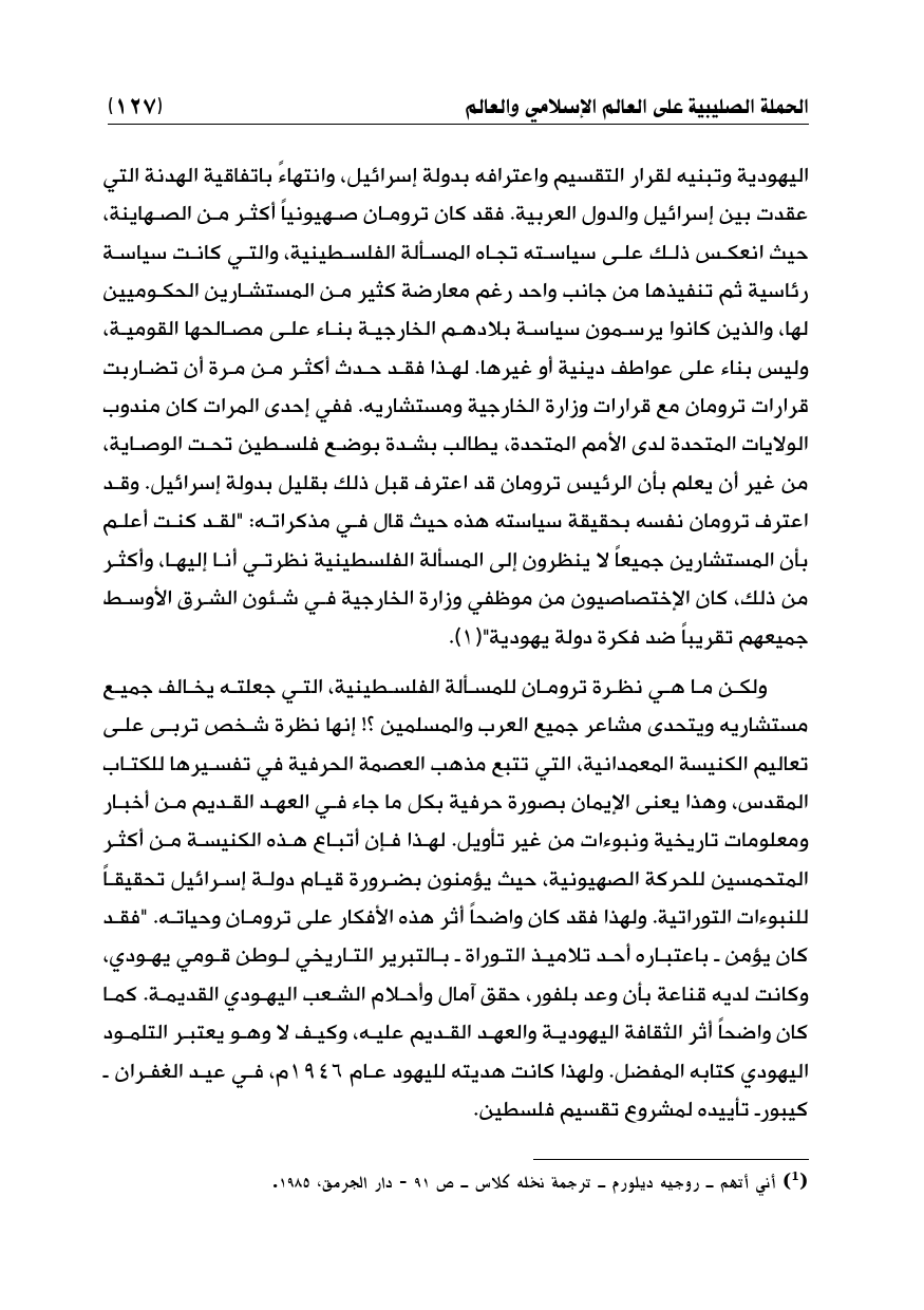 اليهودية وتبنيه لقرار التقسيم واعترافه بدولة إسرائيل، وانتهاءً باتفاقية الهدنة التي عقدت بين إسرائيل والدول العربية. فقد كان ترومان صهيونياً أكثر من الصهاينة، حيث انعكس ذلك على سياسته تجاه المسألة الفلسطينية، والتي كانت سياسة رئاسية ثم تنفيذها من جانب واحد رغم معارضة كثير من المستشارين الحكوميين لها، والذين كانوا يرسمون سياسة بلادهم الخارجية بناء على مصالحها القومية، وليس بناء على عواطف دينية أو غيرها. لهذا فقد حدث أكثر من مرة أن تضاربت قرارات ترومان مع قرارات وزارة الخارجية ومستشاريه. ففي إحدى المرات كان مندوب الولايات المتحدة لدى الأمم المتحدة، يطالب بشدة بوضع فلسطين تحت الوصاية، من غير أن يعلم بأن الرئيس ترومان قد اعترف قبل ذلك بقليل بدولة إسرائيل. وقد اعترف ترومان نفسه بحقيقة سياسته هذه حيث قال في مذكراته: "لقد كنت أعلم بأن المستشارين جميعاً لا ينظرون إلى المسألة الفلسطينية نظرتي أنا إليها، وأكثر من ذلك، كان الإختصاصيون من موظفي وزارة الخارجية في شئون الشرق الأوسط جميعهم تقريباً ضد فكرة دولة يهودية" (¬1).