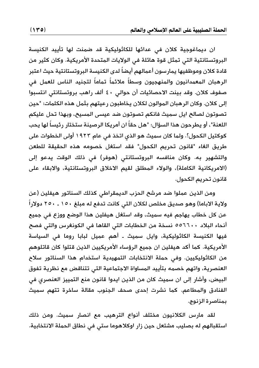 ان ديماغوجية كلان في عدائها للكاثوليكية قد ضمنت لها تأييد الكنيسة البروتستانتية التي تمثل قوة هائلة في الولايات المتحدة الأمريكية. وكان كثير من قادة كلان وموظفيها يمارسون أعمالهم أيضاً لدى الكنيسة البروتستانتية حيث اعتبر الرهبان المعمدانيون والمنهجيون وسطاً ملائماً تماماً لتجنيد الناس للعمل في صفوف كلان. وقد بينت الاحصائيات أن حوالي 40 ألف راهب بروتستانتي انتسبوا إلى كلان. وكان الرهبان الموالون لكلان يخاطبون رعيتهم بثمل هذه الكلمات: "حين تصوتون لصالح ايل سميث فانكم تصوتون ضد عيسى المسيح، وبهذا تحل عليكم اللعنة"، أو يطرحون هذا السؤال: "هل حقاً ان أمريكا الرصينة ستختار رئيساً لها يحب كوكتيل الكحول؟. ولما كان سميث هو الذي اتخذ في عام 1923 أولى الخطوات على طريق الغاء "قانون تحريم الكحول" فقد استغل خصومه هذه الحقيقة للطعن والتشهير به. وكان منافسه البروتستانتي (هوفر) في ذلك الوقت يدعو إلى (الأمريكانية الكاملة)، والولاء المطلق لقيم الاخلاق البروتستانتية، والابقاء على قانون تحريم الكحول.
