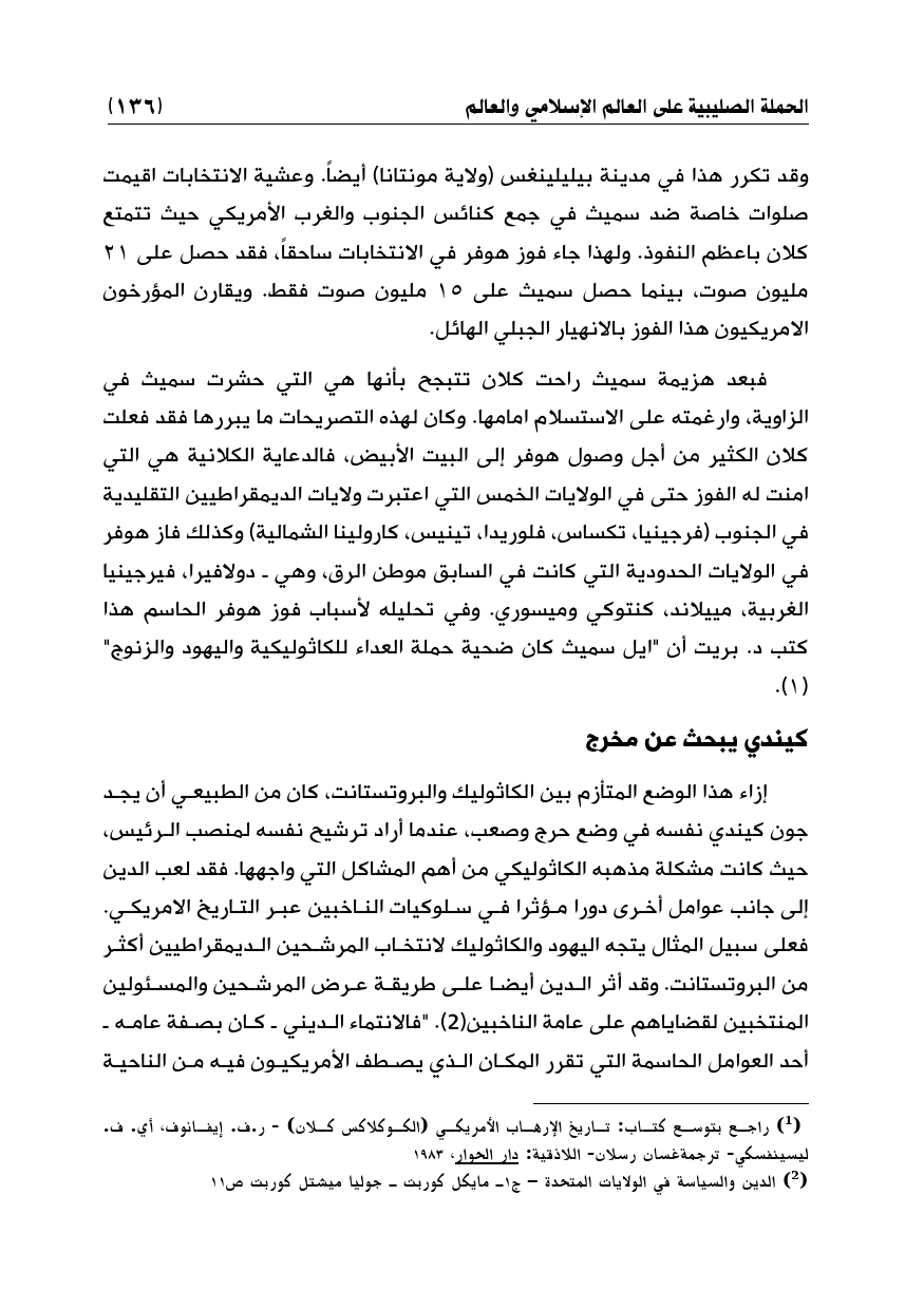 إزاء هذا الوضع المتأزم بين الكاثوليك والبروتستانت، كان من الطبيعي أن يجد جون كيندي نفسه في وضع حرج وصعب، عندما أراد ترشيح نفسه لمنصب الرئيس، حيث كانت مشكلة مذهبه الكاثوليكي من أهم المشاكل التي واجهها. فقد لعب الدين إلى جانب عوامل أخرى دورا مؤثرا في سلوكيات الناخبين عبر التاريخ الأمريكي. فعلى سبيل المثال يتجه اليهود والكاثوليك لانتخاب المرشحين الديمقراطيين أكثر من البروتستانت. وقد أثر الدين أيضا على طريقة عرض المرشحين والمسئولين المنتخبين لقضاياهم على عامة الناخبين (¬2). "فالانتماء الديني ـ كان بصفة عامه ـ أحد العوامل الحاسمة التي تقرر المكان الذي يصطف الأمريكيون فيه من الناحية