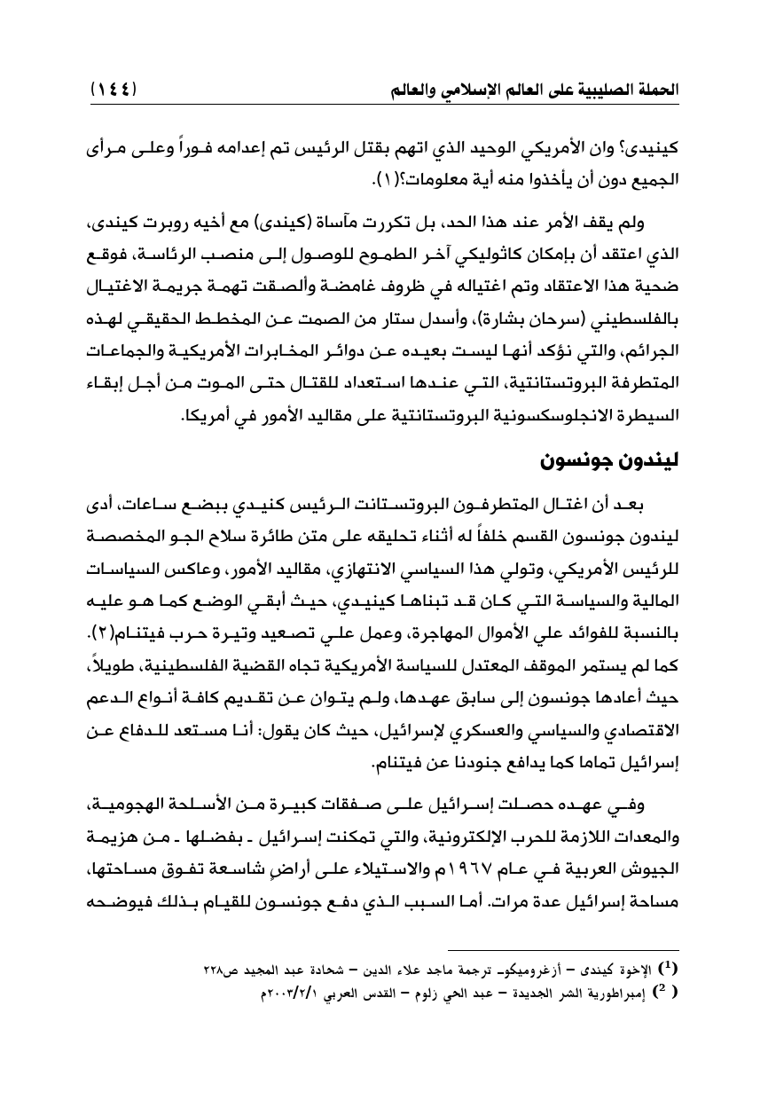 بعد أن اغتال المتطرفون البروتستانت الرئيس كنيدي ببضع ساعات، أدى ليندون جونسون القسم خلفاً له أثناء تحليقه على متن طائرة سلاح الجو المخصصة للرئيس الأمريكي، وتولي هذا السياسي الانتهازي، مقاليد الأمور، وعاكس السياسات المالية والسياسة التي كان قد تبناها كينيدي، حيث أبقي الوضع كما هو عليه بالنسبة للفوائد علي الأموال المهاجرة، وعمل علي تصعيد وتيرة حرب فيتنام (¬2). كما لم يستمر الموقف المعتدل للسياسة الأمريكية تجاه القضية الفلسطينية، طويلاً، حيث أعادها جونسون إلى سابق عهدها، ولم يتوان عن تقديم كافة أنواع الدعم الاقتصادي والسياسي والعسكري لإسرائيل، حيث كان يقول: أنا مستعد للدفاع عن إسرائيل تماما كما يدافع جنودنا عن فيتنام.