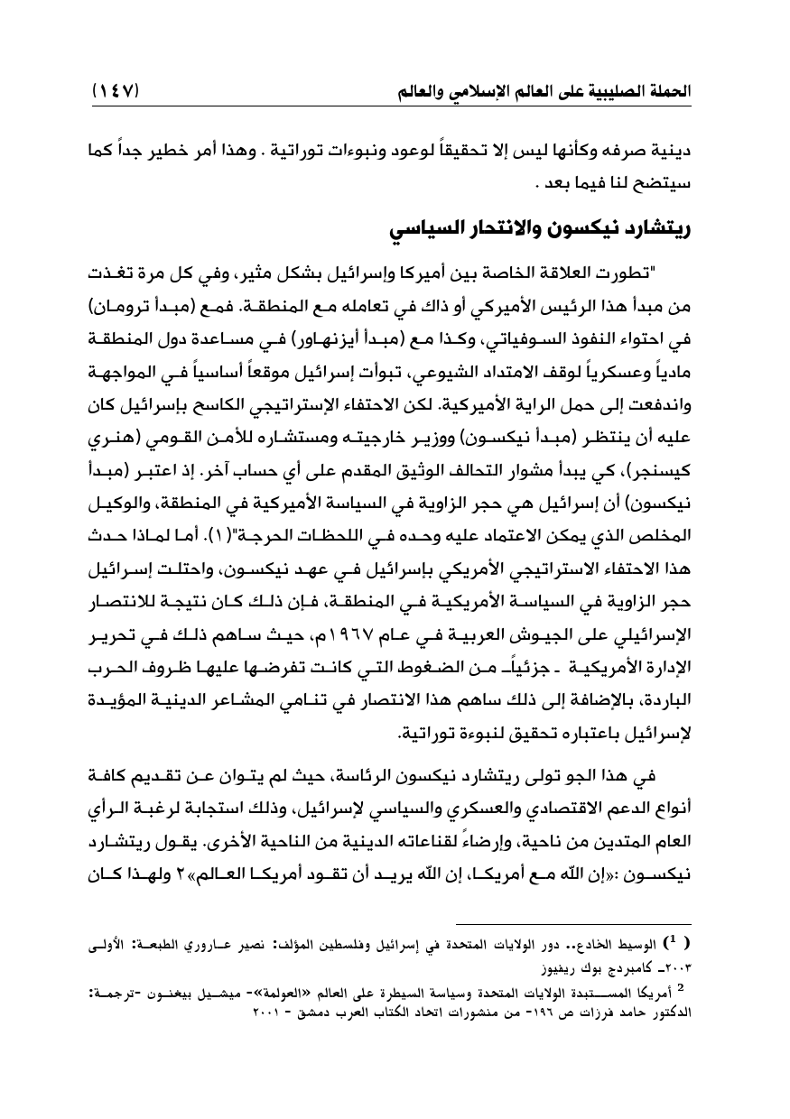 "تطورت العلاقة الخاصة بين أميركا وإسرائيل بشكل مثير, وفي كل مرة تغذت من مبدأ هذا الرئيس الأميركي أو ذاك في تعامله مع المنطقة. فمع (مبدأ ترومان) في احتواء النفوذ السوفياتي, وكذا مع (مبدأ أيزنهاور) في مساعدة دول المنطقة مادياً وعسكرياً لوقف الامتداد الشيوعي، تبوأت إسرائيل موقعاً أساسياً في المواجهة واندفعت إلى حمل الراية الأميركية. لكن الاحتفاء الإستراتيجي الكاسح بإسرائيل كان عليه أن ينتظر (مبدأ نيكسون) ووزير خارجيته ومستشاره للأمن القومي (هنري كيسنجر) , كي يبدأ مشوار التحالف الوثيق المقدم على أي حساب آخر. إذ اعتبر (مبدأ نيكسون) أن إسرائيل هي حجر الزاوية في السياسة الأميركية في المنطقة, والوكيل المخلص الذي يمكن الاعتماد عليه وحده في اللحظات الحرجة" (¬1). أما لماذا حدث هذا الاحتفاء الاستراتيجي الأمريكي بإسرائيل في عهد نيكسون، واحتلت إسرائيل حجر الزاوية في السياسة الأمريكية في المنطقة، فإن ذلك كان نتيجة للانتصار الإسرائيلي على الجيوش العربية في عام 1967م، حيث ساهم ذلك في تحرير الإدارة الأمريكية ـ جزئياًـ من الضغوط التي كانت تفرضها عليها ظروف الحرب الباردة، بالإضافة إلى ذلك ساهم هذا الانتصار في تنامي المشاعر الدينية المؤيدة لإسرائيل باعتباره تحقيق لنبوءة توراتية.