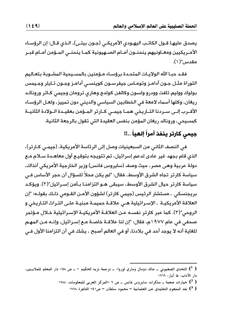 يصدق عليها قول الكاتب اليهودي الأمريكي (جون بيتى)، الذي قال: إن الرؤساء الأمريكيين ومعاونيهم ينحنون أمام الصهيونية كما ينحني المؤمن أمام قبر مقدس" (¬1).