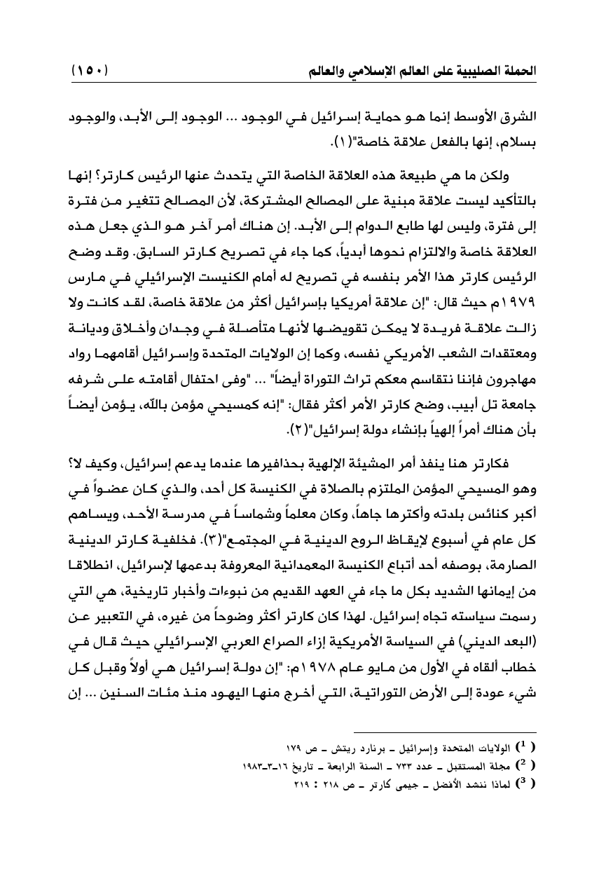 فكارتر هنا ينفذ أمر المشيئة الإلهية بحذافيرها عندما يدعم إسرائيل، وكيف لا؟ وهو المسيحي المؤمن الملتزم بالصلاة في الكنيسة كل أحد، والذي كان عضواً في أكبر كنائس بلدته وأكثرها جاهاً، وكان معلماً وشماساً في مدرسة الأحد، ويساهم كل عام في أسبوع لإيقاظ الروح الدينية في المجتمع" (¬3). فخلفية كارتر الدينية الصارمة، بوصفه أحد أتباع الكنيسة المعمدانية المعروفة بدعمها لإسرائيل، انطلاقا من إيمانها الشديد بكل ما جاء في العهد القديم من نبوءات وأخبار تاريخية، هي التي رسمت سياسته تجاه إسرائيل. لهذا كان كارتر أكثر وضوحاً من غيره، في التعبير عن (البعد الديني) في السياسة الأمريكية إزاء الصراع العربي الإسرائيلي حيث قال في خطاب ألقاه في الأول من مايو عام 1978م: "إن دولة إسرائيل هي أولاً وقبل كل شيء عودة إلى الأرض التوراتية، التي أخرج منها اليهود منذ مئات السنين ... إن