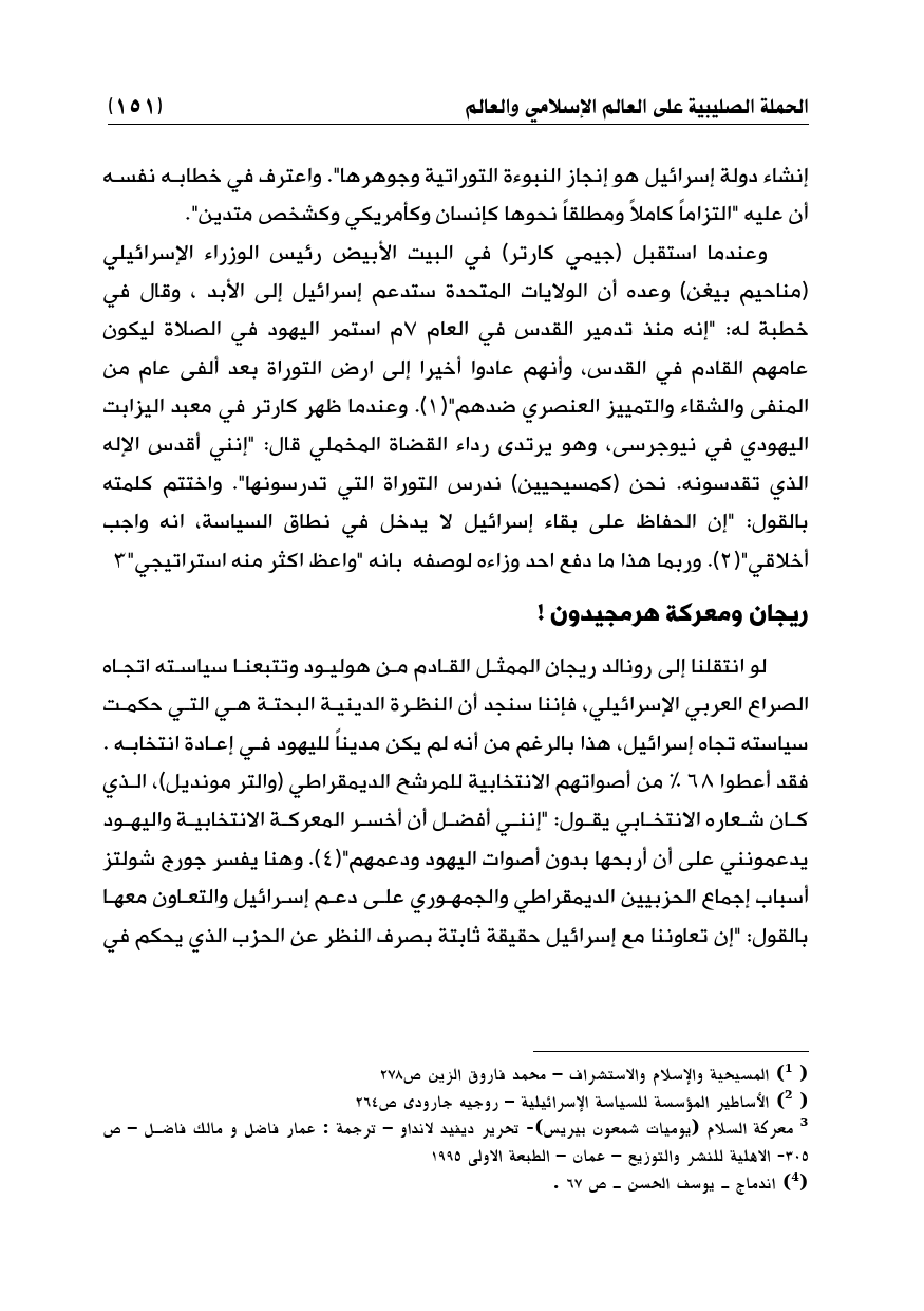 لو انتقلنا إلى رونالد ريجان الممثل القادم من هوليود وتتبعنا سياسته اتجاه الصراع العربي الإسرائيلي، فإننا سنجد أن النظرة الدينية البحتة هي التي حكمت سياسته تجاه إسرائيل، هذا بالرغم من أنه لم يكن مديناً لليهود في إعادة انتخابه. فقد أعطوا 68 % من أصواتهم الانتخابية للمرشح الديمقراطي (والتر مونديل)، الذي كان شعاره الانتخابي يقول: "إنني أفضل أن أخسر المعركة الانتخابية واليهود يدعمونني على أن أربحها بدون أصوات اليهود ودعمهم" (¬4). وهنا يفسر جورج شولتز أسباب إجماع الحزبيين الديمقراطي والجمهوري على دعم إسرائيل والتعاون معها بالقول: "إن تعاوننا مع إسرائيل حقيقة ثابتة بصرف النظر عن الحزب الذي يحكم في