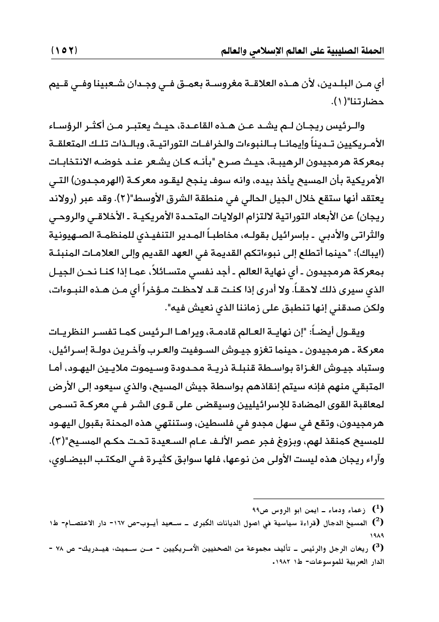 والرئيس ريجان لم يشد عن هذه القاعدة، حيث يعتبر من أكثر الرؤساء الأمريكيين تديناً وإيمانا بالنبوءات والخرافات التوراتية، وبالذات تلك المتعلقة بمعركة هرمجيدون الرهيبة، حيث صرح "بأنه كان يشعر عند خوضه الانتخابات الأمريكية بأن المسيح يأخذ بيده، وانه سوف ينجح ليقود معركة (الهرمجدون) التي يعتقد أنها ستقع خلال الجيل الحالي في منطقة الشرق الأوسط" (¬2). وقد عبر (رولاند ريجان) عن الأبعاد التوراتية لالتزام الولايات المتحدة الأمريكية ـ الأخلاقي والروحي والثراتى والأدبي ـ بإسرائيل بقوله، مخاطباً المدير التنفيذي للمنظمة الصهيونية (ايباك): "حينما أتطلع إلى نبوءاتكم القديمة في العهد القديم وإلى العلامات المنبئة بمعركة هرمجيدون ـ أي نهاية العالم ـ أجد نفسي متسائلاً، عما إذا كنا نحن الجيل الذي سيرى ذلك لاحقاً. ولا أدرى إذا كنت قد لاحظت مؤخراً أي من هذه النبوءات، ولكن صدقني إنها تنطبق على زماننا الذي نعيش فيه".
