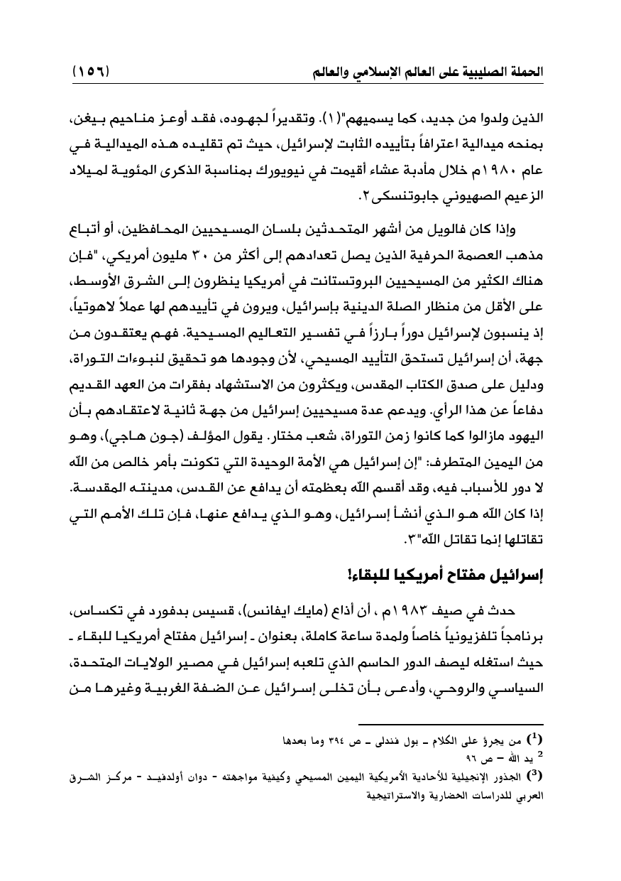 وإذا كان فالويل من أشهر المتحدثين بلسان المسيحيين المحافظين، أو أتباع مذهب العصمة الحرفية الذين يصل تعدادهم إلى أكثر من 30 مليون أمريكي، "فإن هناك الكثير من المسيحيين البروتستانت في أمريكيا ينظرون إلى الشرق الأوسط، على الأقل من منظار الصلة الدينية بإسرائيل، ويرون في تأييدهم لها عملاً لاهوتياً، إذ ينسبون لإسرائيل دوراً بارزاً في تفسير التعاليم المسيحية. فهم يعتقدون من جهة، أن إسرائيل تستحق التأييد المسيحي، لأن وجودها هو تحقيق لنبوءات التوراة، ودليل على صدق الكتاب المقدس، ويكثرون من الاستشهاد بفقرات من العهد القديم دفاعاً عن هذا الرأي. ويدعم عدة مسيحيين إسرائيل من جهة ثانية لاعتقادهم بأن اليهود مازالوا كما كانوا زمن التوراة، شعب مختار. يقول المؤلف (جون هاجي)، وهو من اليمين المتطرف: "إن إسرائيل هي الأمة الوحيدة التي تكونت بأمر خالص من الله لا دور للأسباب فيه، وقد أقسم الله بعظمته أن يدافع عن القدس، مدينته المقدسة. إذا كان الله هو الذي أنشأ إسرائيل، وهو الذي يدافع عنها، فإن تلك الأمم التي تقاتلها إنما تقاتل الله" (¬3).