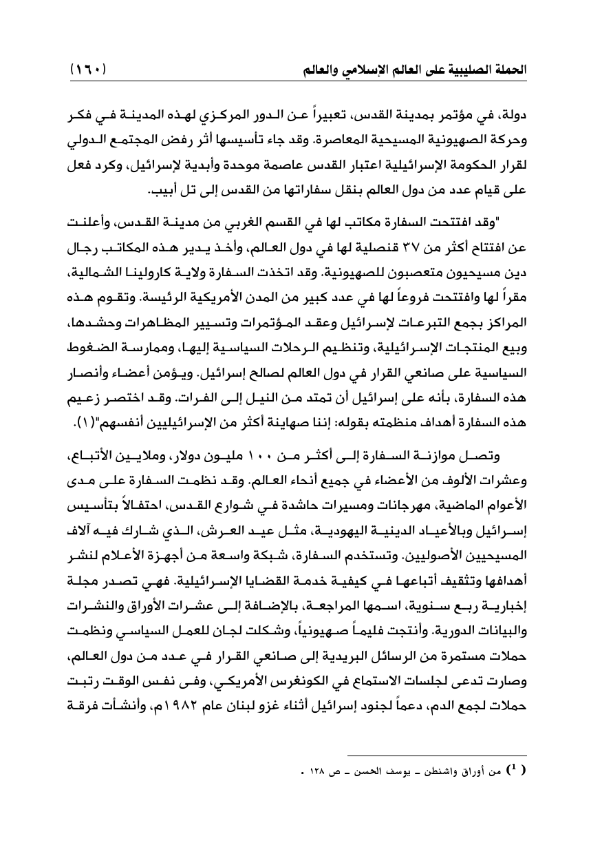"وقد افتتحت السفارة مكاتب لها في القسم الغربي من مدينة القدس، وأعلنت عن افتتاح أكثر من 37 قنصلية لها في دول العالم، وأخذ يدير هذه المكاتب رجال دين مسيحيون متعصبون للصهيونية. وقد اتخذت السفارة ولاية كارولينا الشمالية، مقراً لها وافتتحت فروعاً لها في عدد كبير من المدن الأمريكية الرئيسة. وتقوم هذه المراكز بجمع التبرعات لإسرائيل وعقد المؤتمرات وتسيير المظاهرات وحشدها، وبيع المنتجات الإسرائيلية، وتنظيم الرحلات السياسية إليها، وممارسة الضغوط السياسية على صانعي القرار في دول العالم لصالح إسرائيل. ويؤمن أعضاء وأنصار هذه السفارة، بأنه على إسرائيل أن تمتد من النيل إلى الفرات. وقد اختصر زعيم هذه السفارة أهداف منظمته بقوله: إننا صهاينة أكثر من الإسرائيليين أنفسهم" (¬1).