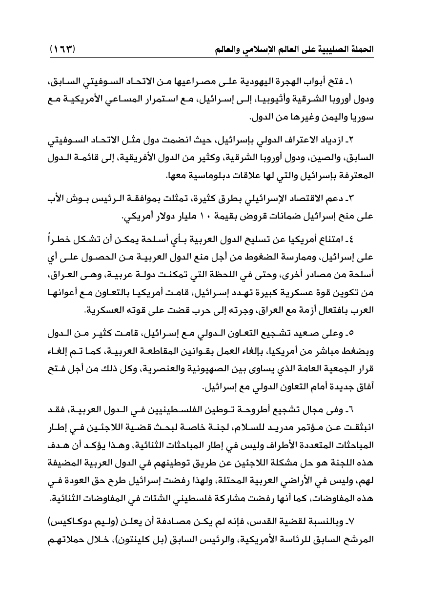 1ـ فتح أبواب الهجرة اليهودية على مصراعيها من الاتحاد السوفيتي السابق، ودول أوروبا الشرقية وأثيوبيا، إلى إسرائيل، مع استمرار المساعي الأمريكية مع سوريا واليمن وغيرها من الدول.
