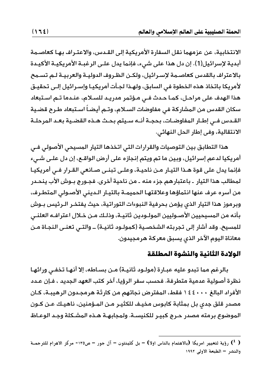 هذا التطابق بين التوصيات والقرارات التي اتخذها التيار المسيحي الأصولي في أمريكيا لدعم إسرائيل، وبين ما تم ويتم إنجازه على أرض الواقع، إن دل على شيء فإنما يدل على قوة هذا التيار من ناحية، وعلى تبنى صانعي القرار في أمريكيا لمطالب هذا التيار ـ باعتبارهم جزء منه ـ من ناحية أخرى. فجورج بوش الأب ينحدر من أسره عرف عنها انتماؤها وعلاقتها الحميمة بالتيار الديني الأصولي المتطرف، وبرموز هذا التيار الذي يؤمن بحرفية النبوءات التوراتية، حيث يفتخر الرئيس بوش بأنه من المسيحيين الأصوليين المولودين ثانية، وذلك من خلال اعترافه العلني للمسيح. وقد أشار إلى تجربته الشخصية (كمولود ثانية) ـ والتي تعنى النجاة من معاناة اليوم الآخر الذي يسبق معركة هرمجيدون.