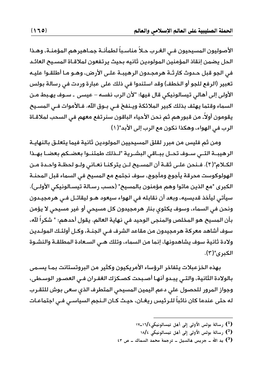 ومن ثم فليس من مبرر لقلق المسيحيين المولودين ثانية فيما يتعلق بالنهاية الرهيبة التي سوف تحل بباقي البشرية "لذلك طمئنوا بعضكم بعضا بهذا الكلام" (¬2). فنحن على ثقة أن المسيح لن يتركنا نعاني ولو لحظة واحدة من الهولوكوست محرقة يأجوج ومأجوج، سوف نجتمع مع المسيح في السماء قبل المحنة الكبرى "مع الذين ماتوا وهم مؤمنون بالمسيح" (حسب رسالة تيسالونيكي الأولى). سيأتي ليأخذ قديسيه، وبعد أن نقابله في الهواء سيعود هو ليقاتل في هرمجيدون ونحن في السماء، وسوف يكتوي بنار هرمجيدون كل مسيحي أو غير مسيحي لا يؤمن بأن المسيح هو المخلص والمنجى الوحيد في نهاية العالم. يقول أحدهم: " شكراً لله، سوف أشاهد معركة هرمجيدون من مقاعد الشرف في الجنة، وكل أولئك المولدين ولادة ثانية سوف يشاهدونها، إنما من السماء، وتلك هي السعادة المطلقة والنشوة الكبرى" (¬3).