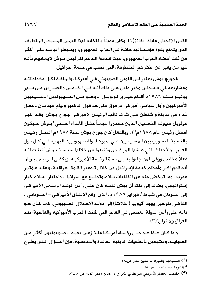 فجورج بوش يعتبر ابن اللوبي الصهيوني في أميركا، والمنفذ لكل مخططاته ومشاريعه في فلسطين وخير دليل على ذلك أنه في الخامس والعشرين من شهر يونيو سنة 1986م أقام جيري فولويل ـ وهو من الصهيونيين المسيحيين الأميركيين وأول سياسي أميركي مرموق على حد قول الدكتور وليام عودمان ـ حفل غداء في مدينة واشنطن على شرف نائب الرئيس الأميركي جورج بوش، وقد اخبر فولويل ضيوفه الخمسين الذين حضروا مجاناً حفل الغداء السخي "بوش سيكون أفضل رئيس عام 1988م" (¬2). وبالفعل كان جورج بوش سنة 1988م أفضل رئيس بالنسبة للصهيونيين المسيحيين في أميركا، وللصهيونيين اليهود في كل دول العالم. والأحداث التي عاشها المراقبون وتتبعوا من خلالها سياسة بوش أثبتت انه فعلاً مخلص ووفي لمن جاءوا به إلى سدة الرئاسة الأميركيه. ويكفى الرئيس بوش أنه قدم اكبر وأعظم خدمة لإسرائيل من خلال تدمير القوة العراقية، وعقد مؤتمر مدريد، وما تمخض عنه من اتفاقيات سلام وتطبيع مع إسرائيل، واعتبار السلام خيار إستراتيجي. يضاف إلى ذلك أن بوش نفسه كان على رأس الوفد الرسمي الأميركي إلى السودان في شباط / فبراير 1985م، الذي وقع الاتفاق الأميركي - السوداني ـ القاضي بترحيل يهود أثيوبيا (الفلاشا) إلى دولة الاحتلال الصهيوني، كما كان هو ذاته على رأس الدولة العظمى في العالم التي شنت (الحرب الأميركيه والعالمية) ضد العراق ولا تزال" (¬3).