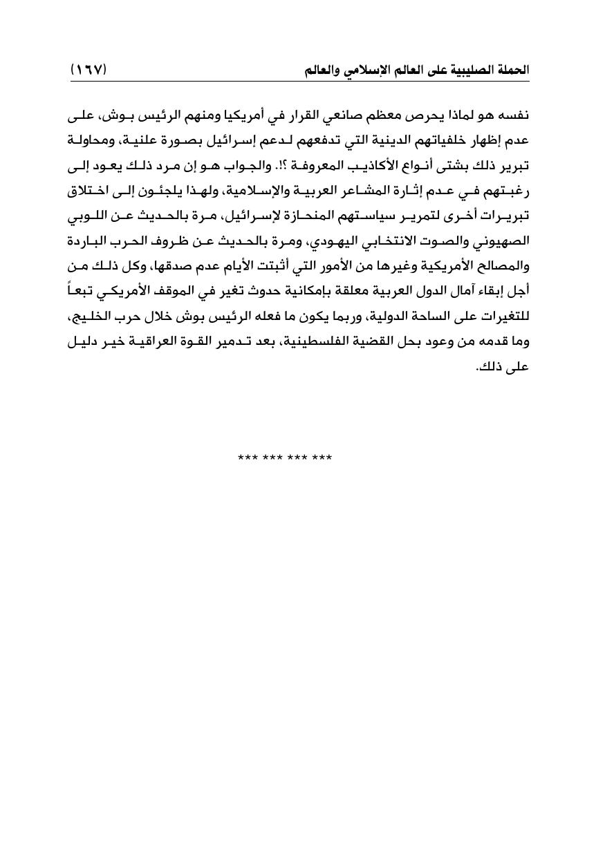 نفسه هو لماذا يحرص معظم صانعي القرار في أمريكيا ومنهم الرئيس بوش، على عدم إظهار خلفياتهم الدينية التي تدفعهم لدعم إسرائيل بصورة علنية، ومحاولة تبرير ذلك بشتى أنواع الأكاذيب المعروفة؟!. والجواب هو إن مرد ذلك يعود إلى رغبتهم في عدم إثارة المشاعر العربية والإسلامية، ولهذا يلجئون إلى اختلاق تبريرات أخرى لتمرير سياستهم المنحازة لإسرائيل، مرة بالحديث عن اللوبي الصهيوني والصوت الانتخابي اليهودي، ومرة بالحديث عن ظروف الحرب الباردة والمصالح الأمريكية وغيرها من الأمور التي أثبتت الأيام عدم صدقها، وكل ذلك من أجل إبقاء آمال الدول العربية معلقة بإمكانية حدوث تغير في الموقف الأمريكي تبعاً للتغيرات على الساحة الدولية، وربما يكون ما فعله الرئيس بوش خلال حرب الخليج، وما قدمه من وعود بحل القضية الفلسطينية، بعد تدمير القوة العراقية خير دليل على ذلك.