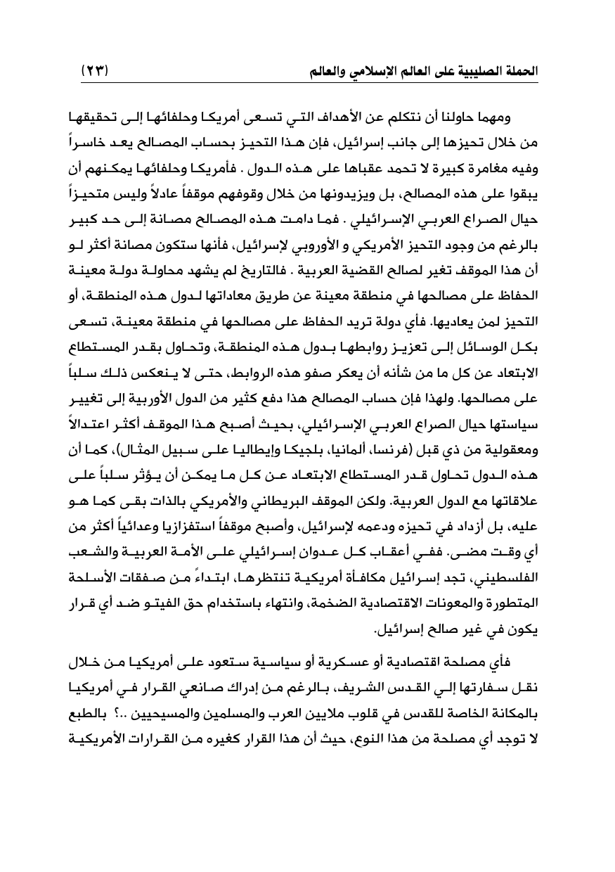 ومهما حاولنا أن نتكلم عن الأهداف التي تسعى أمريكا وحلفائها إلى تحقيقها من خلال تحيزها إلى جانب إسرائيل، فإن هذا التحيز بحساب المصالح يعد خاسراً وفيه مغامرة كبيرة لا تحمد عقباها على هذه الدول. فأمريكا وحلفائها يمكنهم أن يبقوا على هذه المصالح، بل ويزيدونها من خلال وقوفهم موقفاً عادلاً وليس متحيزاً حيال الصراع العربي الإسرائيلي. فما دامت هذه المصالح مصانة إلى حد كبير بالرغم من وجود التحيز الأمريكي و الأوروبي لإسرائيل، فأنها ستكون مصانة أكثر لو أن هذا الموقف تغير لصالح القضية العربية. فالتاريخ لم يشهد محاولة دولة معينة الحفاظ على مصالحها في منطقة معينة عن طريق معاداتها لدول هذه المنطقة، أو التحيز لمن يعاديها. فأي دولة تريد الحفاظ على مصالحها في منطقة معينة، تسعى بكل الوسائل إلى تعزيز روابطها بدول هذه المنطقة، وتحاول بقدر المستطاع الابتعاد عن كل ما من شأنه أن يعكر صفو هذه الروابط، حتى لا ينعكس ذلك سلباً على مصالحها. ولهذا فإن حساب المصالح هذا دفع كثير من الدول الأوربية إلى تغيير سياستها حيال الصراع العربي الإسرائيلي، بحيث أصبح هذا الموقف أكثر اعتدالاً ومعقولية من ذي قبل (فرنسا، ألمانيا، بلجيكا وإيطاليا على سبيل المثال)، كما أن هذه الدول تحاول قدر المستطاع الابتعاد عن كل ما يمكن أن يؤثر سلباً على علاقاتها مع الدول العربية. ولكن الموقف البريطاني والأمريكي بالذات بقى كما هو عليه، بل أزداد في تحيزه ودعمه لإسرائيل، وأصبح موقفاً استفزازيا وعدائياً أكثر من أي وقت مضى. ففي أعقاب كل عدوان إسرائيلي على الأمة العربية والشعب الفلسطيني، تجد إسرائيل مكافأة أمريكية تنتظرها، ابتداءً من صفقات الأسلحة المتطورة والمعونات الاقتصادية الضخمة، وانتهاء باستخدام حق الفيتو ضد أي قرار يكون في غير صالح إسرائيل.