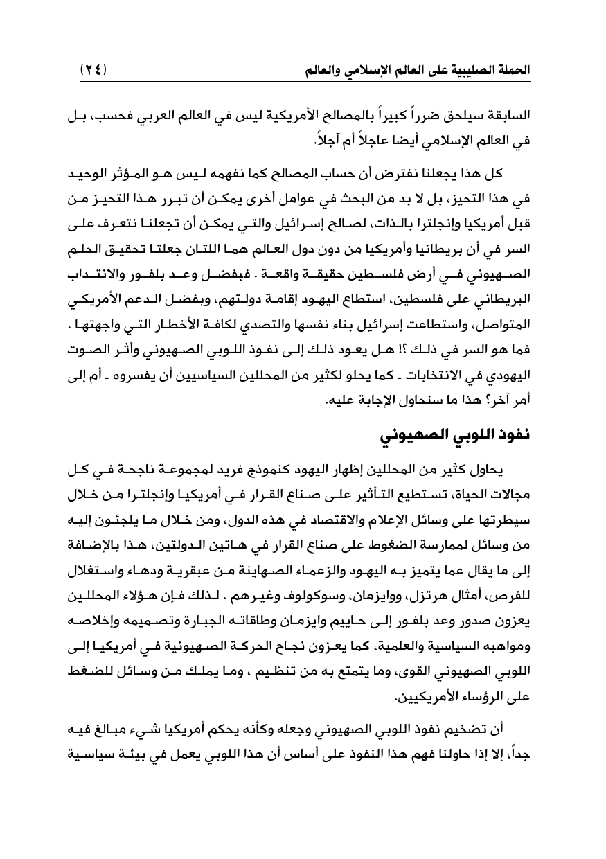 ان تضخيم نفوذ اللوبي الصهيوني وجعله وكأنه يحكم أمريكيا شيء مبالغ فيه جداً، إلا إذا حاولنا فهم هذا النفوذ على أساس أن هذا اللوبي يعمل في بيئة سياسية