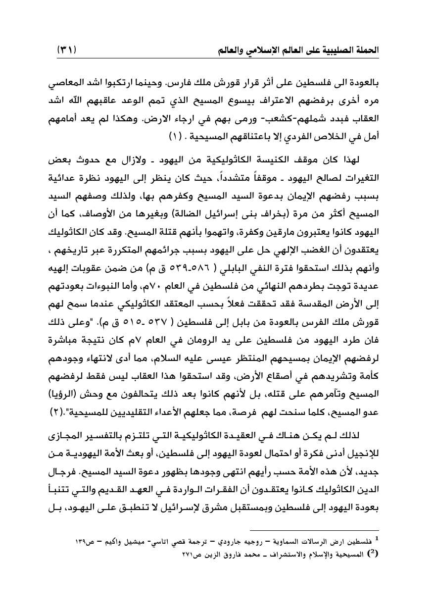 لذلك لم يكن هناك في العقيدة الكاثوليكية التي تلتزم بالتفسير المجازى للإنجيل أدنى فكرة أو احتمال لعودة اليهود إلى فلسطين، أو بعث الأمة اليهودية من جديد، لأن هذه الأمة حسب رأيهم انتهى وجودها بظهور دعوة السيد المسيح. فرجال الدين الكاثوليك كانوا يعتقدون أن الفقرات الواردة في العهد القديم والتي تتنبأ بعودة اليهود إلى فلسطين وبمستقبل مشرق لإسرائيل لا تنطبق على اليهود،