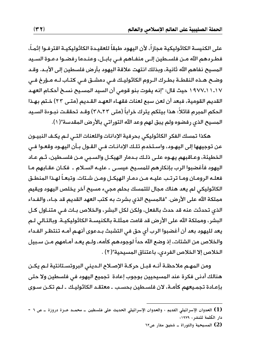 بل على الكنيسة الكاثوليكية مجازاً، لأن اليهود طبقاً للعقيدة الكاثوليكية اقترفوا إثماً، فطردهم الله من فلسطين إلى منفاهم في بابل، وعندما رفضوا دعوة السيد المسيح نفاهم الله ثانية، وبذلك انتهت علاقة اليهود بأرض فلسطين إلى الأبد. وقد وضح هذه النقطة بطرك الروم الكاثوليك في دمشق في كتاب له مؤرخ في 17ـ11ـ1977 حيث قال: "إنه يفوت بنو قومي أن السيد المسيح نسخ أحكام العهد القديم القومية، فبعد أن لعن سبع لعنات فقهاء العهد القديم (متى 23) ختم بهذا الحكم المبرم قائلاً: هذا بيتكم يترك خراباً (متى 23ـ38) وقد تحققت نبوءة السيد المسيح الذي رفضوه ولم يبق لهم وعد الله التوراتي بالأرض المقدسة" (¬1).