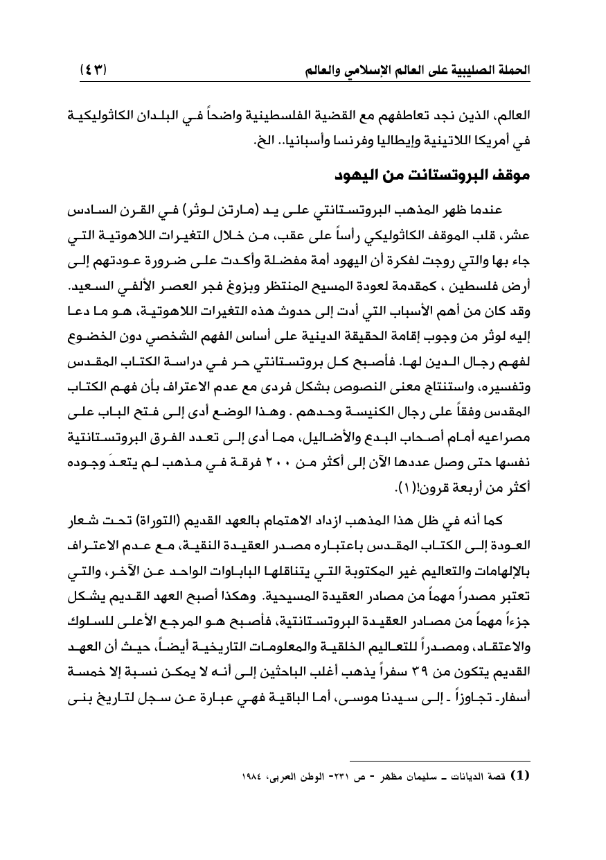 عندما ظهر المذهب البروتستانتي على يد (مارتن لوثر) في القرن السادس عشر، قلب الموقف الكاثوليكي رأساً على عقب، من خلال التغيرات اللاهوتية التي جاء بها والتي روجت لفكرة أن اليهود أمة مفضلة وأكدت على ضرورة عودتهم إلى أرض فلسطين، كمقدمة لعودة المسيح المنتظر وبزوغ فجر العصر الألفي السعيد. وقد كان من أهم الأسباب التي أدت إلى حدوث هذه التغيرات اللاهوتية، هو ما دعا إليه لوثر من وجوب إقامة الحقيقة الدينية على أساس الفهم الشخصي دون الخضوع لفهم رجال الدين لها. فأصبح كل بروتستانتي حر في دراسة الكتاب المقدس وتفسيره، واستنتاج معنى النصوص بشكل فردى مع عدم الاعتراف بأن فهم الكتاب المقدس وفقاً على رجال الكنيسة وحدهم. وهذا الوضع أدى إلى فتح الباب على مصراعيه أمام أصحاب البدع والأضاليل، مما أدى إلى تعدد الفرق البروتستانتية نفسها حتى وصل عددها الآن إلى أكثر من 200 فرقة في مذهب لم يتعدَ وجوده أكثر من أربعة قرون! (¬1).
