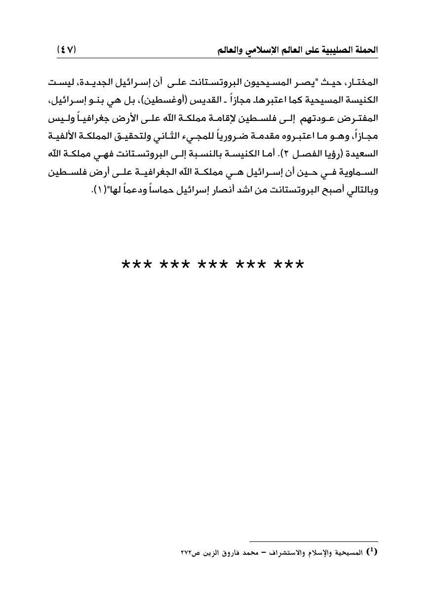 المختار، حيث "يصر المسيحيون البروتستانت على أن إسرائيل الجديدة، ليست الكنيسة المسيحية كما اعتبرهاـ مجازاً ـ القديس (أوغسطين)، بل هي بنو إسرائيل، المفترض عودتهم إلى فلسطين لإقامة مملكة الله على الأرض جغرافياً وليس مجازاً، وهو ما اعتبروه مقدمة ضرورياً للمجيء الثاني ولتحقيق المملكة الألفية السعيدة (رؤيا الفصل 2). أما الكنيسة بالنسبة إلى البروتستانت فهي مملكة الله السماوية في حين أن إسرائيل هي مملكة الله الجغرافية على أرض فلسطين وبالتالي أصبح البروتستانت من اشد أنصار إسرائيل حماساً ودعماً لها" (¬1).