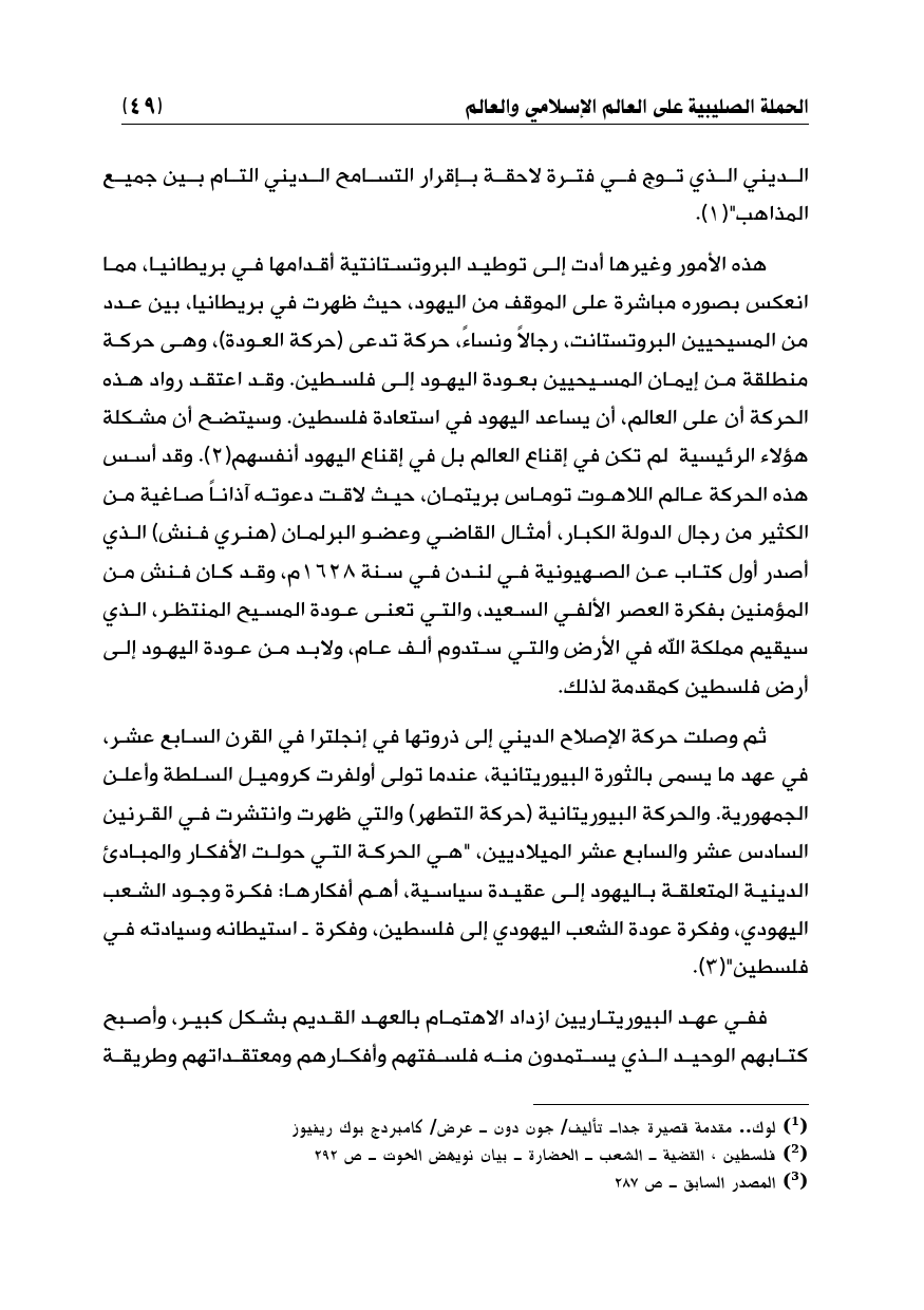 هذه الأمور وغيرها أدت إلى توطيد البروتستانتية أقدامها في بريطانيا، مما انعكس بصوره مباشرة على الموقف من اليهود، حيث ظهرت في بريطانيا، بين عدد من المسيحيين البروتستانت، رجالاً ونساءً، حركة تدعى (حركة العودة)، وهى حركة منطلقة من إيمان المسيحيين بعودة اليهود إلى فلسطين. وقد اعتقد رواد هذه الحركة أن على العالم، أن يساعد اليهود في استعادة فلسطين. وسيتضح أن مشكلة هؤلاء الرئيسية لم تكن في إقناع العالم بل في إقناع اليهود أنفسهم (¬2). وقد أسس هذه الحركة عالم اللاهوت توماس بريتمان، حيث لاقت دعوته آذاناً صاغية من الكثير من رجال الدولة الكبار، أمثال القاضي وعضو البرلمان (هنري فنش) الذي أصدر أول كتاب عن الصهيونية في لندن في سنة 1628م، وقد كان فنش من المؤمنين بفكرة العصر الألفي السعيد، والتي تعنى عودة المسيح المنتظر، الذي سيقيم مملكة الله في الأرض والتي ستدوم ألف عام، ولابد من عودة اليهود إلى أرض فلسطين كمقدمة لذلك.