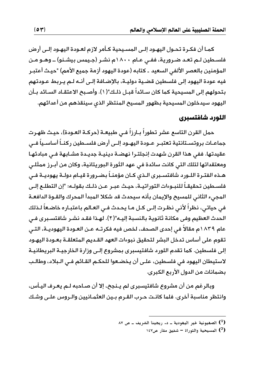 حمل القرن التاسع عشر تطوراً بارزاً في طبيعة (حركة العودة)، حيث ظهرت جماعات بروتستانتية تعتبر عودة اليهود إلى أرض فلسطين ركناً أساسياً في عقيدتها. ففي هذا القرن شهدت إنجلترا نهضة دينية جديدة مشابهة في مبادئها ومعتقداتها لتلك التي كانت سائدة في عهد الثورة البوريتانية، وكان من أبرز ممثلي هذه الفترة اللورد شافتسبرى الذي كان مؤمناً بضرورة قيام دولة يهودية في فلسطين تحقيقاً للنبوءات التوراتية، حيث عبر عن ذلك بقوله: "إن التطلع إلى المجيء الثاني للمسيح والإيمان بأنه سيحدث قد شكلا المبدأ المحرك والقوة الدافعة في حياتي، نظراً لأني نظرت إلى كل ما يحدث في العالم باعتباره خاضعاً لذلك الحدث العظيم وفي مكانة ثانوية بالنسبة إليه" (¬2). لهذا فقد نشر شافتسبرى في عام 1839م مقالاً في إحدى الصحف، لخص فيه فكرته عن العودة اليهودية، التي تقوم على أساس تدخل البشر لتحقيق نبوءات العهد القديم المتعلقة بعودة اليهود إلى فلسطين. كما تقدم اللورد شافتيسبرى بمشروع إلى وزارة الخارجية البريطانية لاستيطان اليهود في فلسطين، على أن يخضعوا للحكم القائم في البلاد، وطالب بضمانات من الدول الأربع الكبرى.