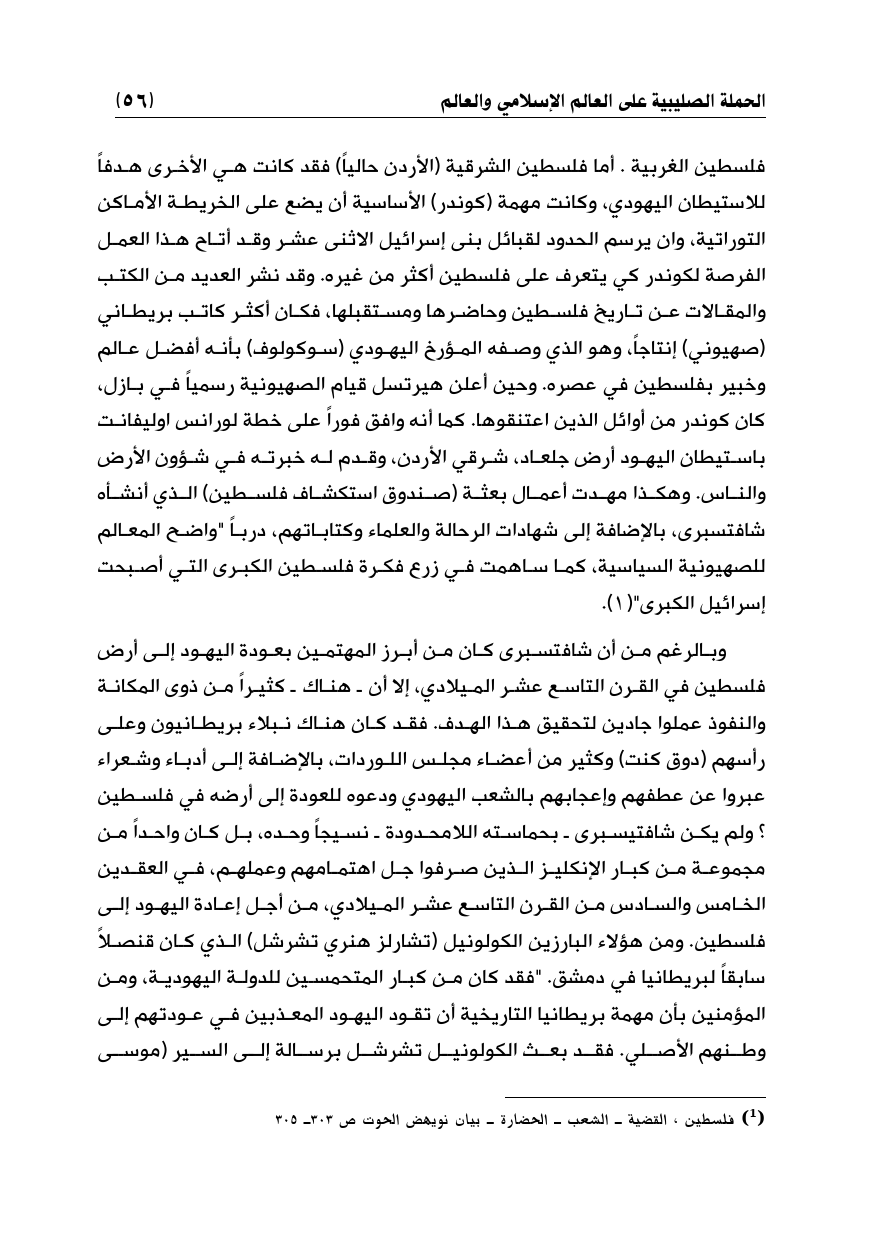 فلسطين الغربية. أما فلسطين الشرقية (الأردن حالياً) فقد كانت هي الأخرى هدفاً للاستيطان اليهودي، وكانت مهمة (كوندر) الأساسية أن يضع على الخريطة الأماكن التوراتية، وان يرسم الحدود لقبائل بنى إسرائيل الاثنى عشر وقد أتاح هذا العمل الفرصة لكوندر كي يتعرف على فلسطين أكثر من غيره. وقد نشر العديد من الكتب والمقالات عن تاريخ فلسطين وحاضرها ومستقبلها، فكان أكثر كاتب بريطاني (صهيوني) إنتاجاً، وهو الذي وصفه المؤرخ اليهودي (سوكولوف) بأنه أفضل عالم وخبير بفلسطين في عصره. وحين أعلن هيرتسل قيام الصهيونية رسمياً في بازل، كان كوندر من أوائل الذين اعتنقوها. كما أنه وافق فوراً على خطة لورانس اوليفانت باستيطان اليهود أرض جلعاد، شرقي الأردن، وقدم له خبرته في شؤون الأرض والناس. وهكذا مهدت أعمال بعثة (صندوق استكشاف فلسطين) الذي أنشأه شافتسبرى، بالإضافة إلى شهادات الرحالة والعلماء وكتاباتهم، درباً "واضح المعالم للصهيونية السياسية، كما ساهمت في زرع فكرة فلسطين الكبرى التي أصبحت إسرائيل الكبرى" (¬1).