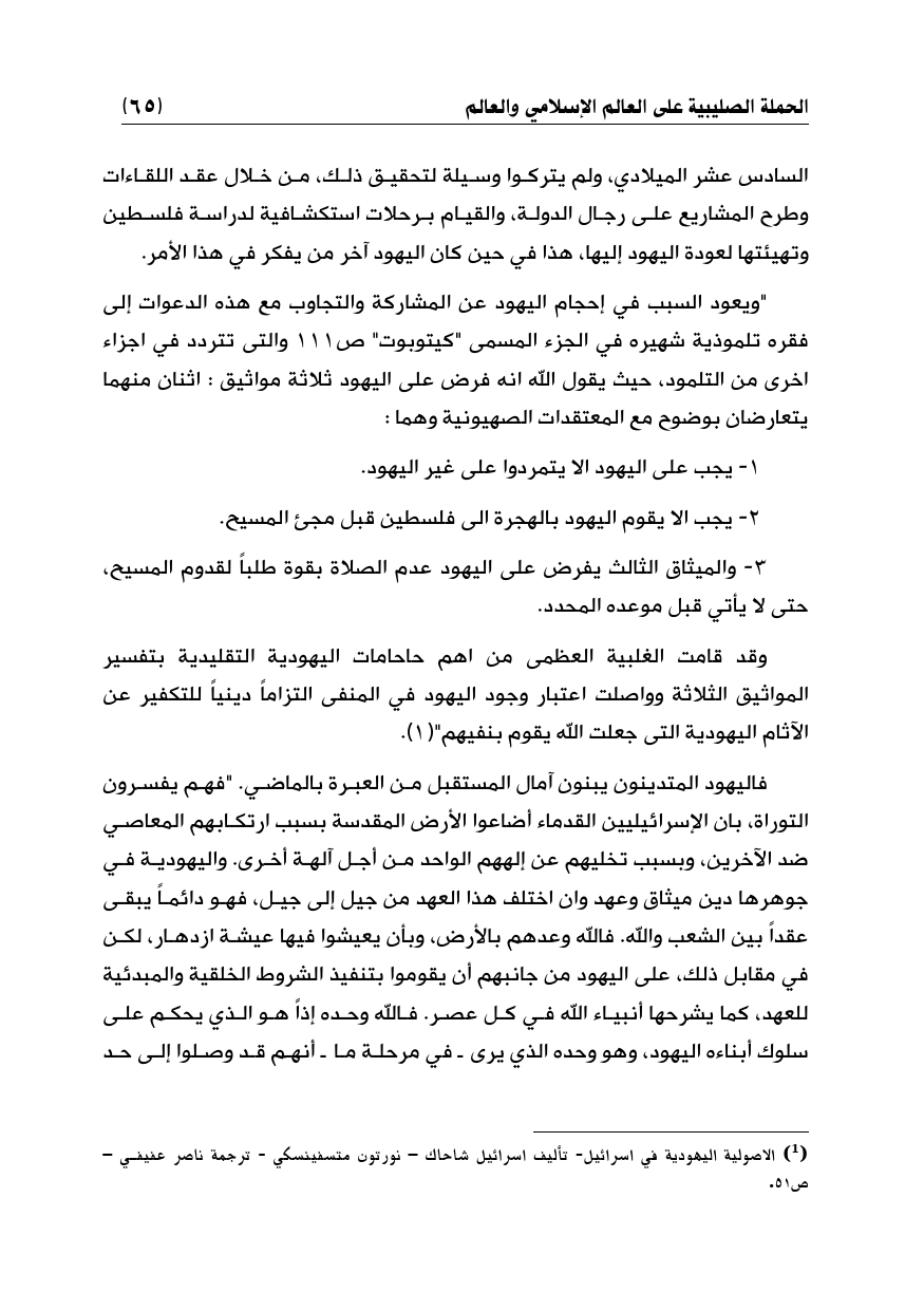 "ويعود السبب في إحجام اليهود عن المشاركة والتجاوب مع هذه الدعوات إلى فقره تلموذية شهيره في الجزء المسمى "كيتوبوت" ص111 والتى تتردد في اجزاء اخرى من التلمود، حيث يقول الله انه فرض على اليهود ثلاثة مواثيق: اثنان منهما يتعارضان بوضوح مع المعتقدات الصهيونية وهما: