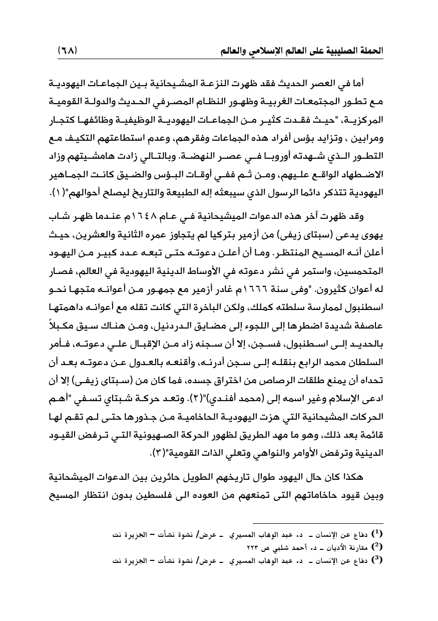 وقد ظهرت آخر هذه الدعوات الميشيحانية في عام 1648م عندما ظهر شاب يهوى يدعى (سبتاى زيفى) من أزمير بتركيا لم يتجاوز عمره الثانية والعشرين، حيث أعلن أنه المسيح المنتظر. وما أن أعلن دعوته حتى تبعه عدد كبير من اليهود المتحمسين، واستمر في نشر دعوته في الأوساط الدينية اليهودية في العالم، فصار له أعوان كثيرون. "وفي سنة 1666م غادر أزمير مع جمهور من أعوانه متجها نحو اسطنبول لممارسة سلطته كملك، ولكن الباخرة التي كانت تقله مع أعوانه داهمتها عاصفة شديدة اضطرها إلى اللجوء إلى مضايق الدردنيل، ومن هناك سيق مكبلاً بالحديد إلى اسطنبول، فسجن، إلا أن سجنه زاد من الإقبال علي دعوته، فأمر السلطان محمد الرابع بنقله إلى سجن أدرنه، وأقنعه بالعدول عن دعوته بعد أن تحداه أن يمنع طلقات الرصاص من اختراق جسده، فما كان من (سبتاى زيفى) إلا أن ادعى الإسلام وغير اسمه إلى (محمد أفندي) " (¬2). وتعد حركة شبتاي تسفي "أهم الحركات المشيحانية التي هزت اليهودية الحاخامية من جذورها حتى لم تقم لها قائمة بعد ذلك، وهو ما مهد الطريق لظهور الحركة الصهيونية التي ترفض القيود الدينية وترفض الأوامر والنواهي وتعلي الذات القومية" (¬3).