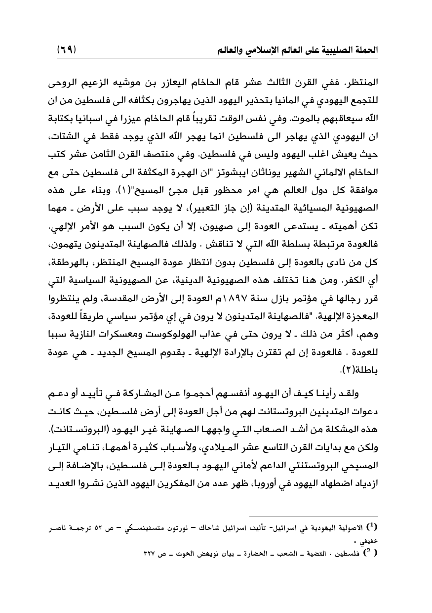 المنتظر. ففي القرن الثالث عشر قام الحاخام اليعازر بن موشيه الزعيم الروحى للتجمع اليهودي في المانيا بتحذير اليهود الذين يهاجرون بكثافه إلى فلسطين من ان الله سيعاقبهم بالموت. وفي نفس الوقت تقريباً قام الحاخام عيزرا في اسبانيا بكتابة ان اليهودي الذي يهاجر إلى فلسطين انما يهجر الله الذي يوجد فقط في الشتات، حيث يعيش اغلب اليهود وليس في فلسطين. وفي منتصف القرن الثامن عشر كتب الحاخام الالماني الشهير يوناثان ايبشوتز "ان الهجرة المكثفة إلى فلسطين حتى مع موافقة كل دول العالم هي امر محظور قبل مجئ المسيح" (¬1). وبناء على هذه الصهيونية المسيائية المتدينة (إن جاز التعبير)، لا يوجد سبب على الأرض ـ مهما تكن أهميته ـ يستدعى العودة إلى صهيون، إلا أن يكون السبب هو الأمر الإلهي. فالعودة مرتبطة بسلطة الله التي لا تناقش. ولذلك فالصهاينة المتدينون يتهمون، كل من نادى بالعودة إلى فلسطين بدون انتظار عودة المسيح المنتظر، بالهرطقة، أي الكفر. ومن هنا تختلف هذه الصهيونية الدينية، عن الصهيونية السياسية التي قرر رجالها في مؤتمر بازل سنة 1897م العودة إلى الأرض المقدسة، ولم ينتظروا المعجزة الإلهية. "فالصهاينة المتدينون لا يرون في إي مؤتمر سياسي طريقاً للعودة، وهم، أكثر من ذلك ـ لا يرون حتى في عذاب الهولوكوست ومعسكرات النازية سببا للعودة. فالعودة إن لم تقترن بالإرادة الإلهية ـ بقدوم المسيح الجديد ـ هي عودة باطلة (¬2).