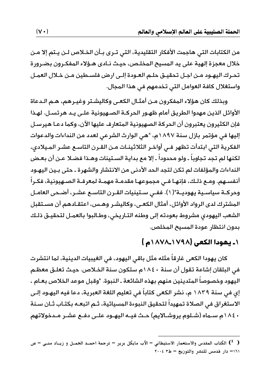 وبذلك كان هؤلاء المفكرون من أمثال الكعى وكاليشتر وغيرهم، هم الدعاة الأوائل الذين مهدوا الطريق أمام ظهور الحركة الصهيونية على يد هرتسل. لهذا فإن الكثيرون يعتبرون أن الحركة الصهيونية المتعارف عليها الآن، وكما دعا هيرسل إليها في مؤتمر بازل سنة 1897م، "هي الوارث الشرعي لعدد من النداءات والدعوات الفكرية التي ابتدأت تظهر في أواخر الثلاثينات من القرن التاسع عشر الميلادي، لكنها لم تجد تجاوباً ـ ولو محدوداً ـ إلا مع بداية الستينات وهذا فضلا عن أن بعض النداءات والمؤلفات لم تكن لتجد الحد الأدنى من الانتشار والشهرة ـ حتى بين اليهود أنفسهم. ومع ذلك، فإنها في مجموعها مقدمة مهمة لمعرفة الصهيونية، فكراً وحركة سياسية يهودية" (¬1). ففي ستينيات القرن التاسع عشر، أضحى العامل المشترك لدى الرواد الأوائل، أمثال الكعى، وكاليشر وهس، اعتقادهم أن مستقبل الشعب اليهودي مشروط بعودته إلى وطنه التاريخي، وطالبوا بالعمل لتحقيق ذلك بدون انتظار عودة المسيح المخلص.