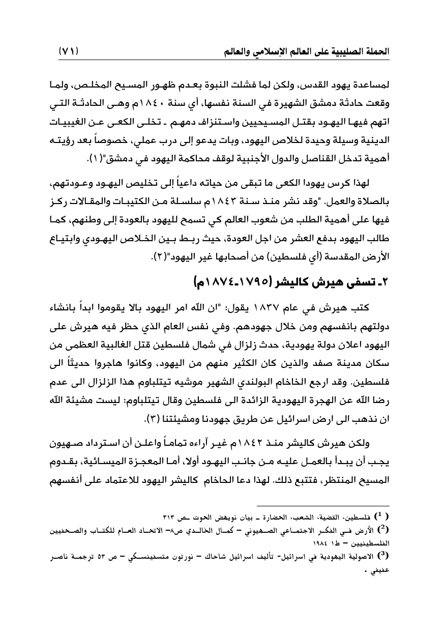 لمساعدة يهود القدس، ولكن لما فشلت النبوة بعدم ظهور المسيح المخلص، ولما وقعت حادثة دمشق الشهيرة في السنة نفسها، أي سنة 1840م وهى الحادثة التي اتهم فيها اليهود بقتل المسيحيين واستنزاف دمهم ـ تخلى الكعى عن الغيبيات الدينية وسيلة وحيدة لخلاص اليهود، وبات يدعو إلى درب عملي، خصوصاً بعد رؤيته أهمية تدخل القناصل والدول الأجنبية لوقف محاكمة اليهود في دمشق" (¬1).