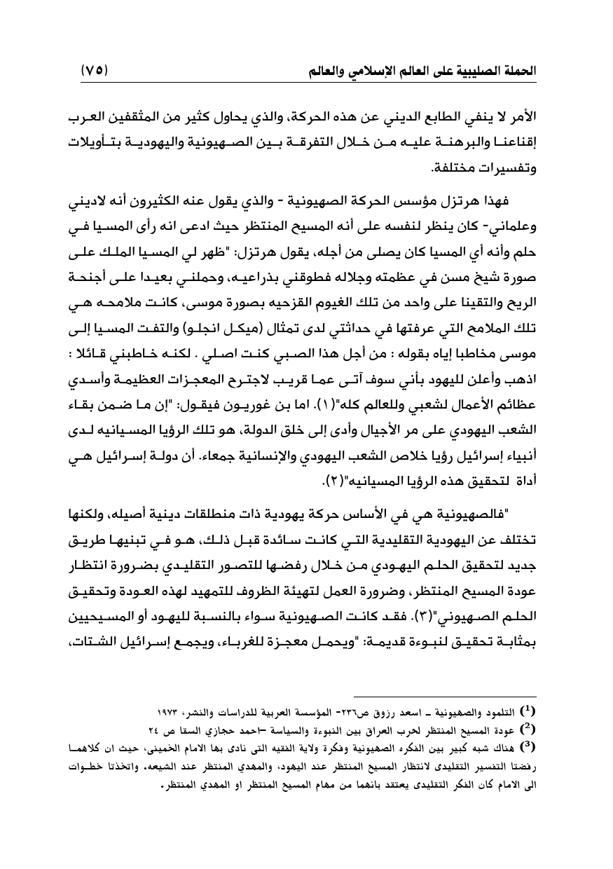 الأمر لا ينفي الطابع الديني عن هذه الحركة، والذي يحاول كثير من المثقفين العرب إقناعنا والبرهنة عليه من خلال التفرقة بين الصهيونية واليهودية بتأويلات وتفسيرات مختلفة.