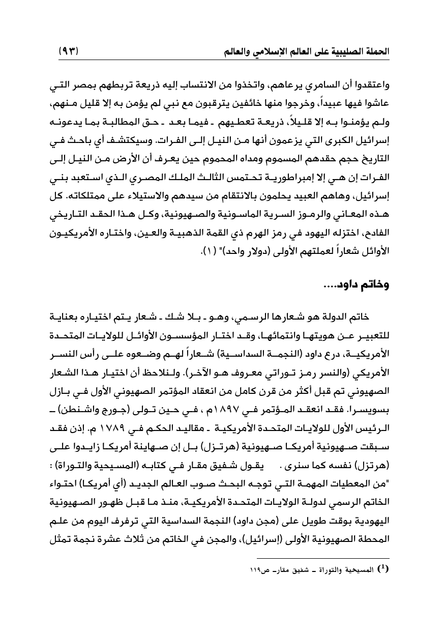 واعتقدوا أن السامري يرعاهم، واتخذوا من الانتساب إليه ذريعة تربطهم بمصر التي عاشوا فيها عبيداً، وخرجوا منها خائفين يترقبون مع نبي لم يؤمن به إلا قليل منهم، ولم يؤمنوا به إلا قليلاً، ذريعة تعطيهم ـ فيما بعد ـ حق المطالبة بما يدعونه إسرائيل الكبرى التي يزعمون أنها من النيل إلى الفرات. وسيكتشف أي باحث في التاريخ حجم حقدهم المسموم ومداه المحموم حين يعرف أن الأرض من النيل إلى الفرات إن هي إلا إمبراطورية تحتمس الثالث الملك المصري الذي استعبد بني إسرائيل، وهاهم العبيد يحلمون بالانتقام من سيدهم والاستيلاء على ممتلكاته. كل هذه المعاني والرموز السرية الماسونية والصهيونية، وكل هذا الحقد التاريخي الفادح، اختزله اليهود في رمز الهرم ذي القمة الذهبية والعين، واختاره الأمريكيون الأوائل شعاراً لعملتهم الأولى (دولار واحد) " (¬1).