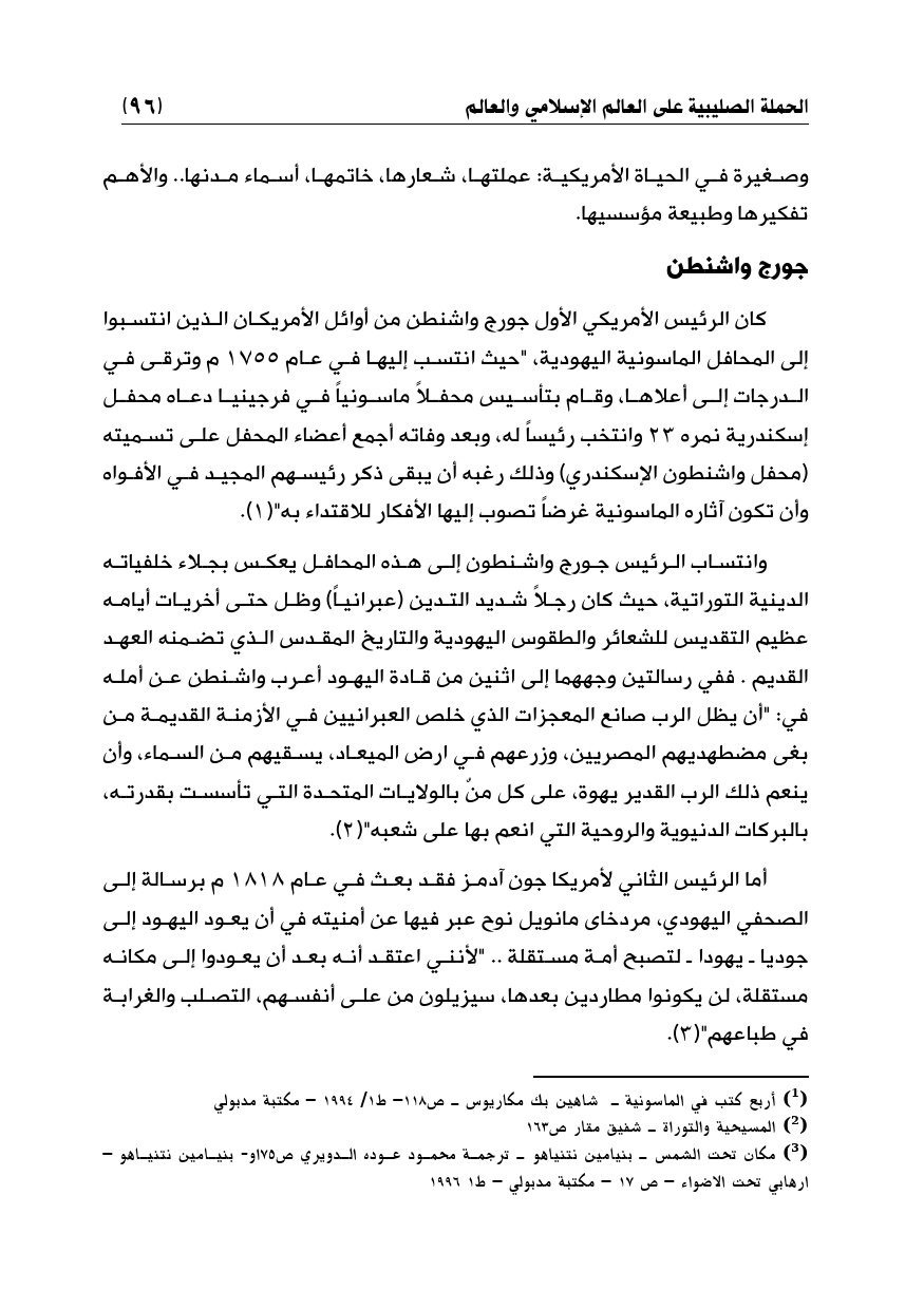 وانتساب الرئيس جورج واشنطون إلى هذه المحافل يعكس بجلاء خلفياته الدينية التوراتية، حيث كان رجلاً شديد التدين (عبرانياً) وظل حتى أخريات أيامه عظيم التقديس للشعائر والطقوس اليهودية والتاريخ المقدس الذي تضمنه العهد القديم. ففي رسالتين وجههما إلى اثنين من قادة اليهود أعرب واشنطن عن أمله في: "أن يظل الرب صانع المعجزات الذي خلص العبرانيين في الأزمنة القديمة من بغى مضطهديهم المصريين، وزرعهم في ارض الميعاد، يسقيهم من السماء، وأن ينعم ذلك الرب القدير يهوة، على كل منٌ بالولايات المتحدة التي تأسست بقدرته، بالبركات الدنيوية والروحية التي انعم بها على شعبه" (¬2).