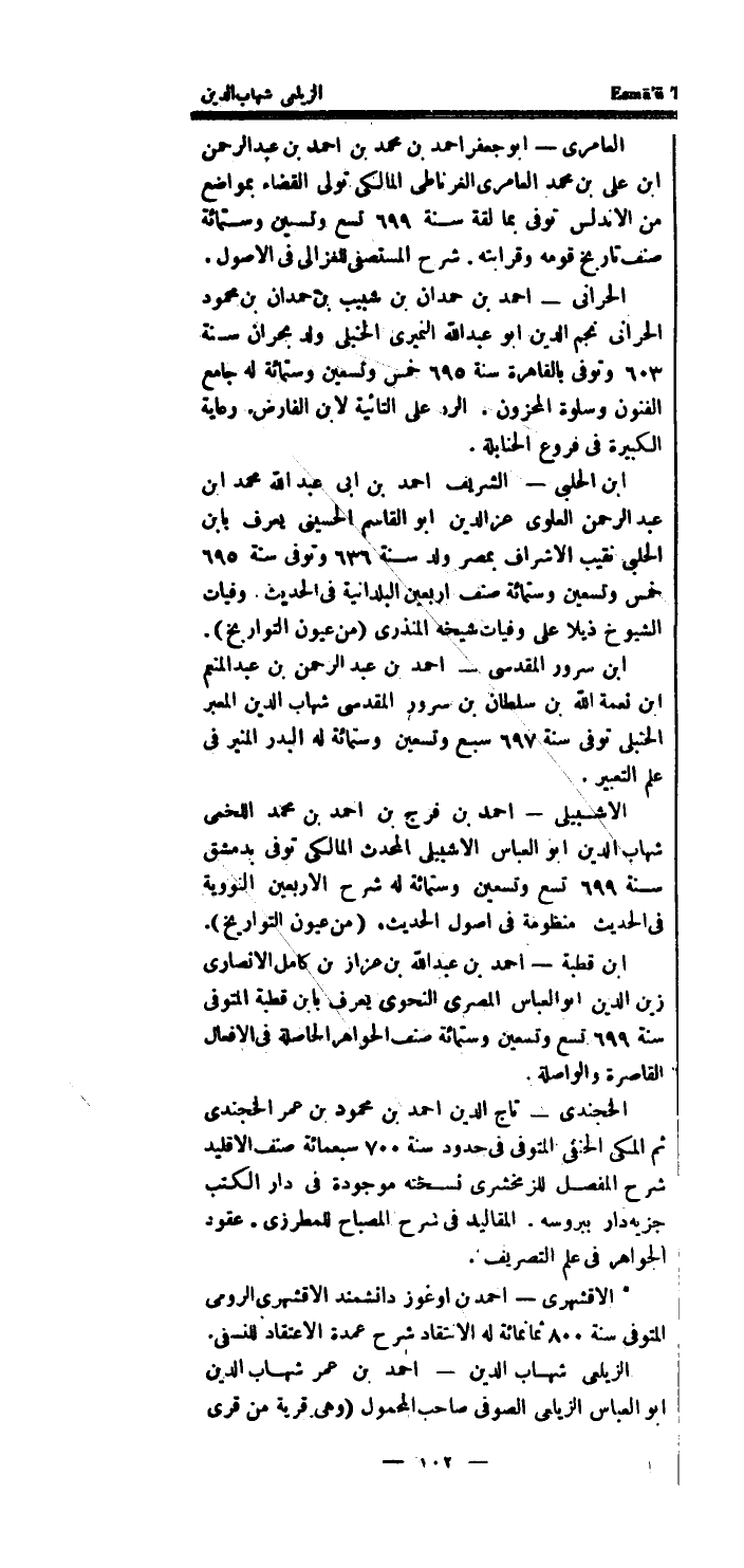 الزيلعى شهَاب الدَّين - احْمَد بن عمر شهَاب الدَّين أَبُو الْعَبَّاس الزيلعى الصوفى صَاحب الْمَحْمُول (وهى قَرْيَة من قرى