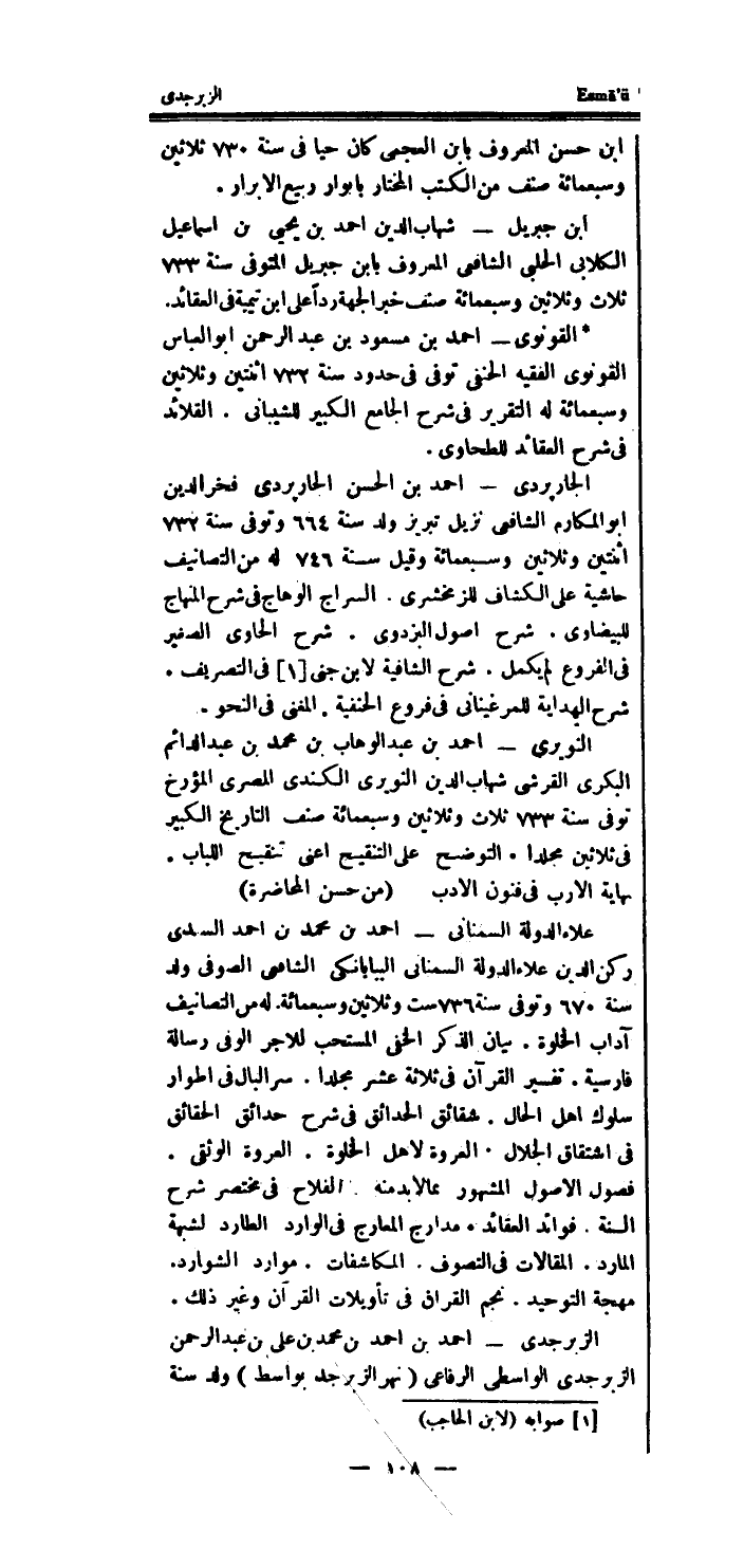 نِهَايَة الارب فِي فنون الادب (من حسن المحاضرة) عَلَاء الدولة السمنانى - احْمَد بن مُحَمَّد بن احْمَد السدى ركن الدَّين عَلَاء الدولة السمنانى البيابانكى الشَّافِعِي الصوفى ولد سنة 670 وَتوفى سنة 736 سِتّ وَثَلَاثِينَ وَسَبْعمائة.