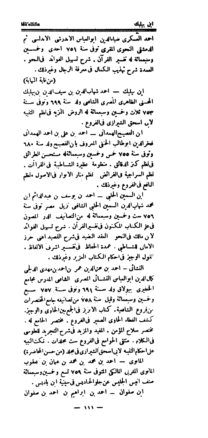 (من غَايَة النِّهَايَة) ابْن بيلبك - احْمَد شهَاب الدَّين سيف الدَّين بن بيلبك المحسني الظاهرى المصرى الشَّافِعِي ولد سنة 699 وَتوفى سنة 753 ثَلَاث وَخمسين وَسَبْعمائة لَهُ الرَّوْض النزيه فِي نظم التَّنْبِيه لابي اسحق الشِّيرَازِيّ فِي الْفُرُوع.