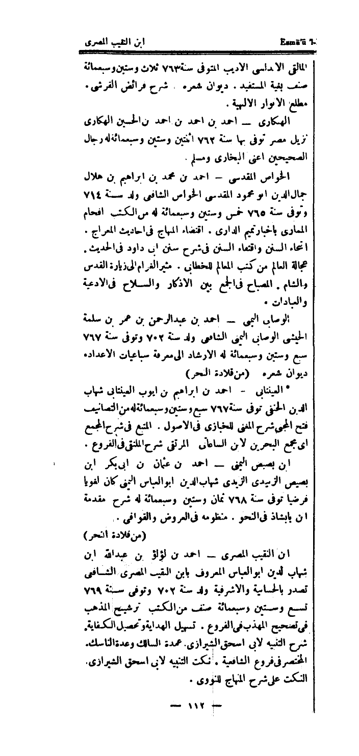(من قلادة النَّحْر) ابْن النَّقِيب المصرى - احْمَد بن لُؤْلُؤ بن عبد الله ابْن شهَاب لدين أَبُو الْعَبَّاس الْمَعْرُوف بِابْن النَّقِيب المصرى الشَّافِعِي تصدر بالحسانية والاشرفية ولد سنة 702 وَتوفى سنة 769 تسع وَسِتِّينَ وَسَبْعمائة صنف من الْكتب ترشيح الْمَذْهَب فِي تَصْحِيح الْمَذْهَب فِي الْفُرُوع.