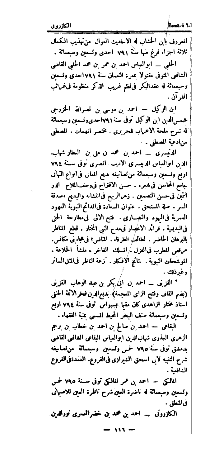 المالكى - احْمَد بن عمر المالكى توفى سنة 795 خمس وَتِسْعين وَسَبْعمائة لَهُ ناضرة الْعين شرح ناظرة الْعين للاصبهاني فِي الْمنطق.
