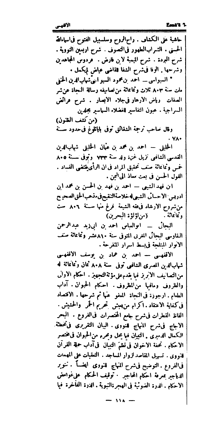 الاقفهسى - احْمَد بن عماد بن يُوسُف الاقفهسى شهَاب الدَّين المصرى الشَّافِعِي توفى سنة 808 ثَمَان وَثَمَانمِائَة لَهُ من التصانيف الابريز فِيمَا يقدم على مؤثة التَّجْهِيز، احكام الاولى والظروف وَمَا فِيهَا من المظروف.