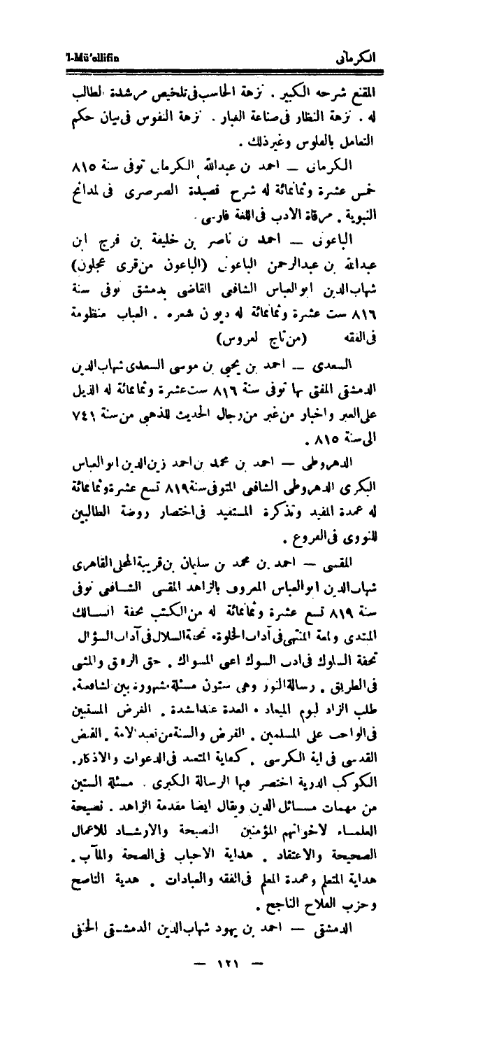 الْكرْمَانِي - احْمَد بن عبد الله الْكرْمَانِي توفى سنة 815 خمس عشرَة وَثَمَانمِائَة لَهُ شرح قصيدة الصرصرى فِي المدائح النَّبَوِيَّة.
