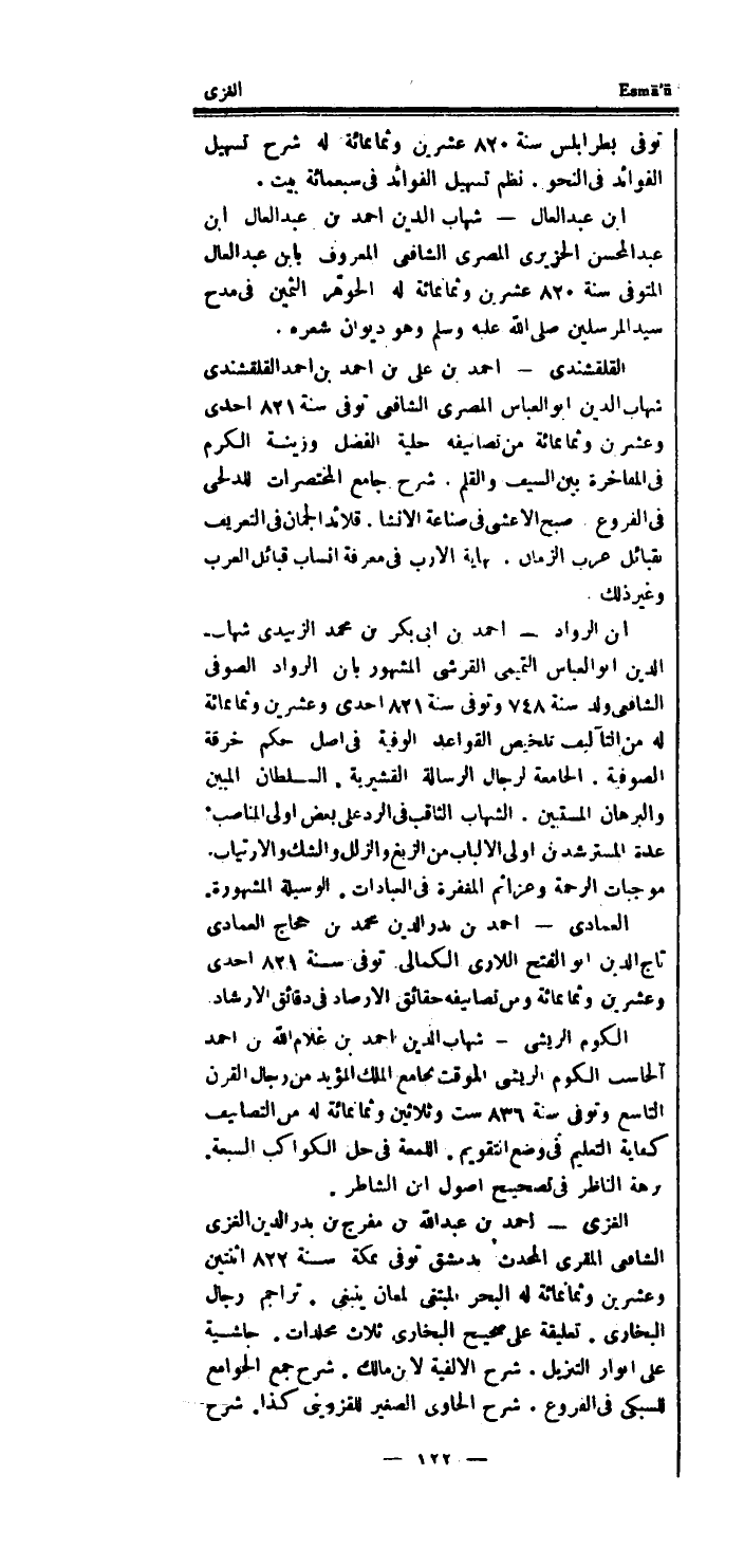 القلقشندى - احْمَد بن على بن احْمَد بن احْمَد القلقشندى شهَاب الدَّين أَبُو الْعَبَّاس المصرى الشَّافِعِي توفى سنة 821 احدى وَعشْرين وَثَمَانمِائَة من تصانيفه حلية الْفضل وزينة الْكَرم فِي الْمُفَاخَرَة بَين السَّيْف والقلم.