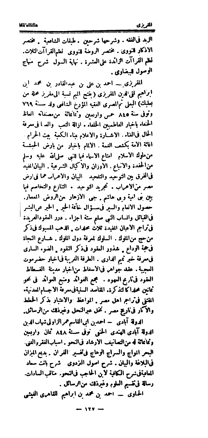 المقريزى - احْمَد بن على بن عبد الْقَادِر بن مُحَمَّد ابْن ابراهيم تقى الدَّين المقريزى (بِفَتْح الْمِيم نِسْبَة إِلَى مقريز محلّة من بعلبك) البعلى ثمَّ المصرى الْفَقِيه المؤرخ الشَّافِعِي ولد سنة 769 وَتوفى سنة 845 خمس واربعين وَثَمَانمِائَة من مصنفاته اتعاظ الحنفاء باخيار الفاطميين الْخُلَفَاء.