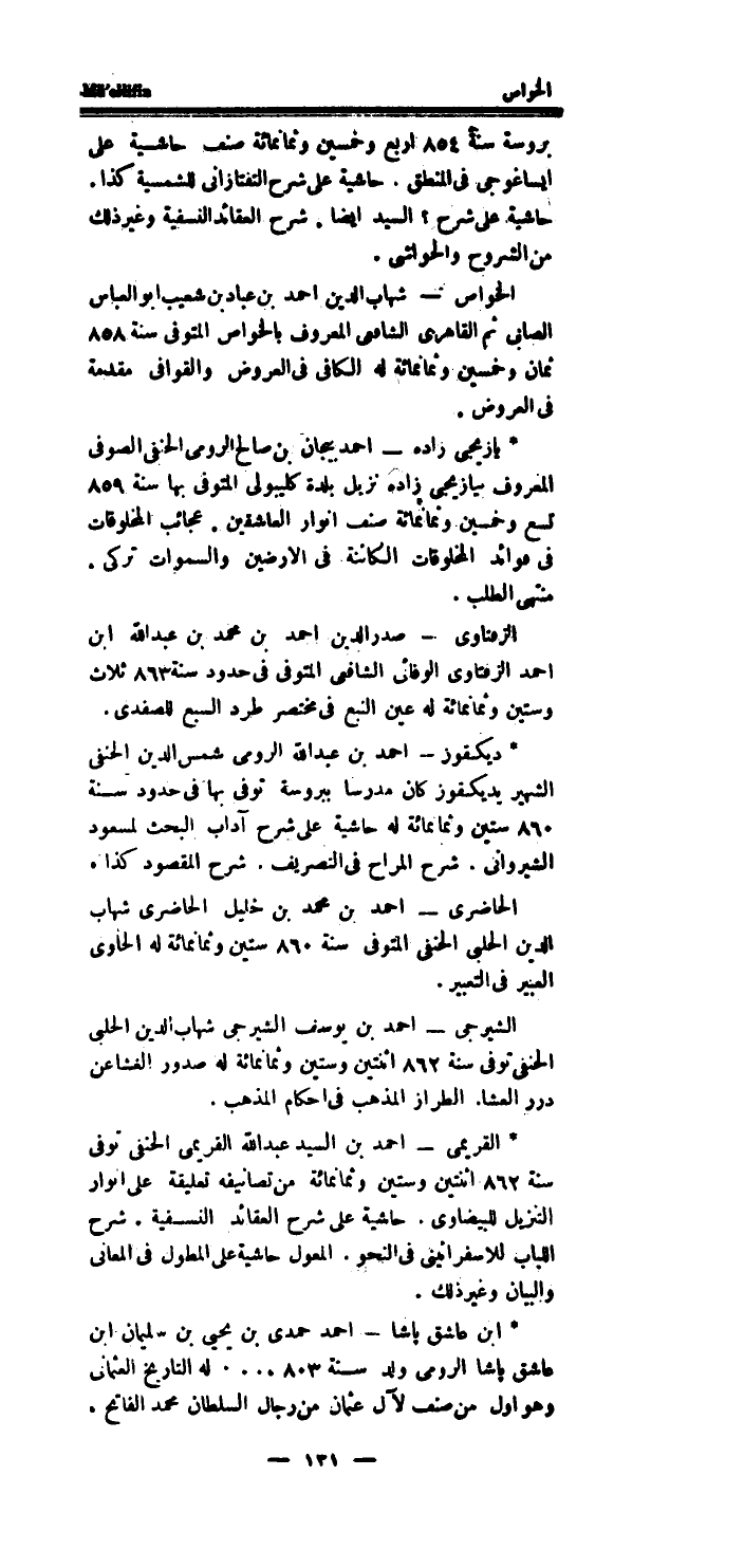 بروسة سنة 854 ارْبَعْ وَخمسين وَثَمَانمِائَة صنف حَاشِيَة على ايساغوجى فِي الْمنطق.