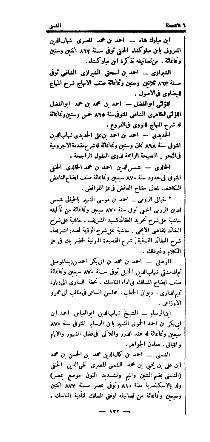 الشمنى - احْمَد بن كَمَال الدَّين مُحَمَّد بن الْحسن بن مُحَمَّد ابْن على بن يحيى بن مُحَمَّد الشمنى المصرى تقى الدَّين الْحَنَفِيّ (الشمنى بِضَم الشين وَالْمِيم وَتَشْديد النُّون مَوضِع بِمصْر) ولد بالاسكندرية سنة 810 وَتوفى بِمصْر سنة 872 اثْنَتَيْنِ وَسبعين وَثَمَانمِائَة من تصانيفه اوفق المسالك لتأدية الْمَنَاسِك.