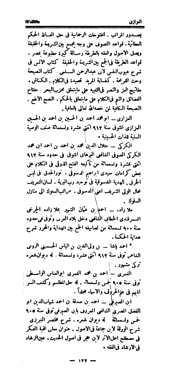 الكركي - جلال الدَّين مُحَمَّد بن احْمَد بن احْمَد ابْن مُحَمَّد الكركي الصوفى الشَّافِعِي البرهانى الْمُتَوفَّى فِي حُدُود سنة 912 اثنتى عشرَة وَتِسْعمِائَة من تآليفه الْفَتْح الذوقى فِي الْكَلَام على بعض كرامات سيدى ابراهيم الدسوقي.