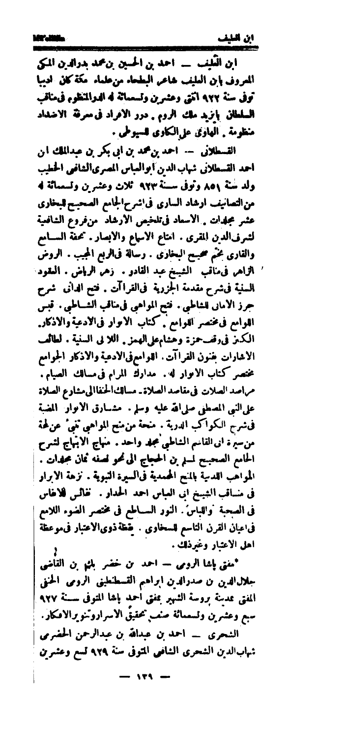 القسطلانى - احْمَد بن مُحَمَّد بن ابى بكر بن عبد الملك ابْن احْمَد القسطلانى شهَاب الدَّين أَبُو الْعَبَّاس المصرى الشَّافِعِي الْخَطِيب ولد سنة 851 وَتوفى سنة 923 ثَلَاث وَعشْرين وَتِسْعمِائَة لَهُ من التصانيف ارشاد السارى فِي اشرح الْجَامِع الصَّحِيح للْبُخَارِيّ عشر مجلدات.